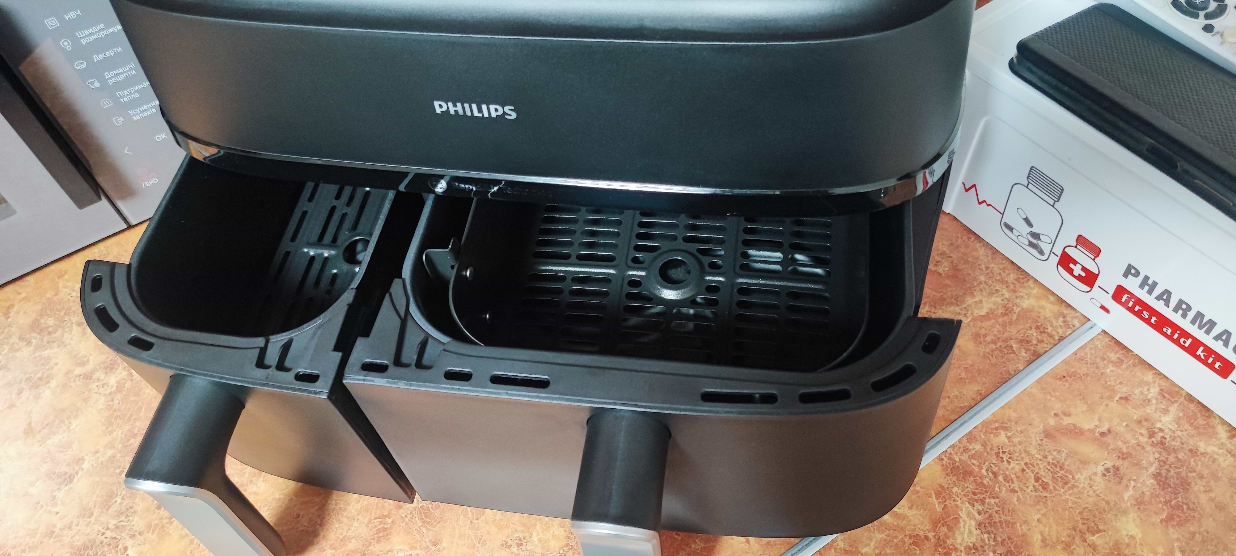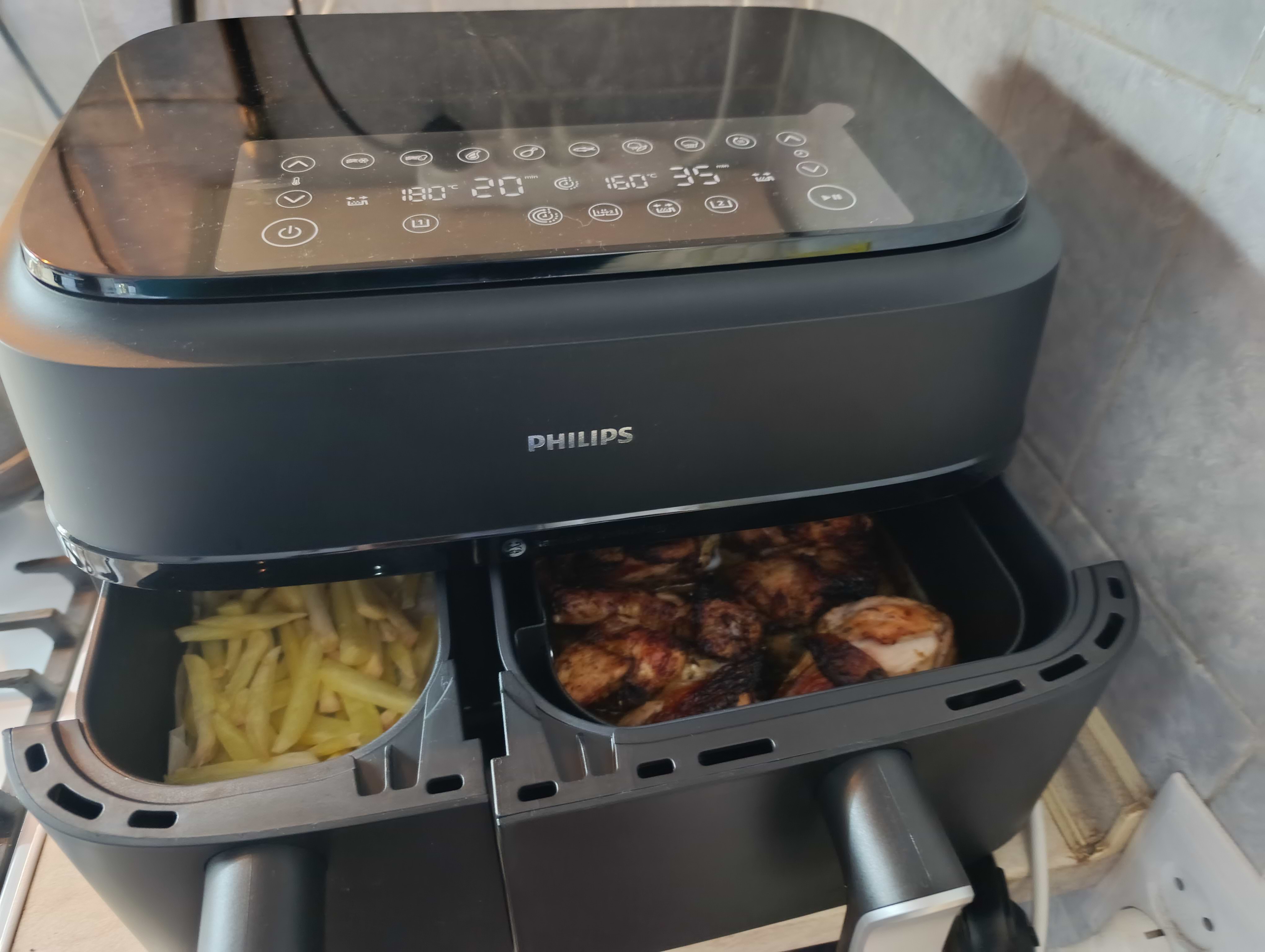 Аерогриль чудовий. Зручно готувати у двох ємностях зразу (наприклад, м'ясо і картоплю фрі). Має систему синхронізації, коли закінчення приготування двох страв є одночасним.