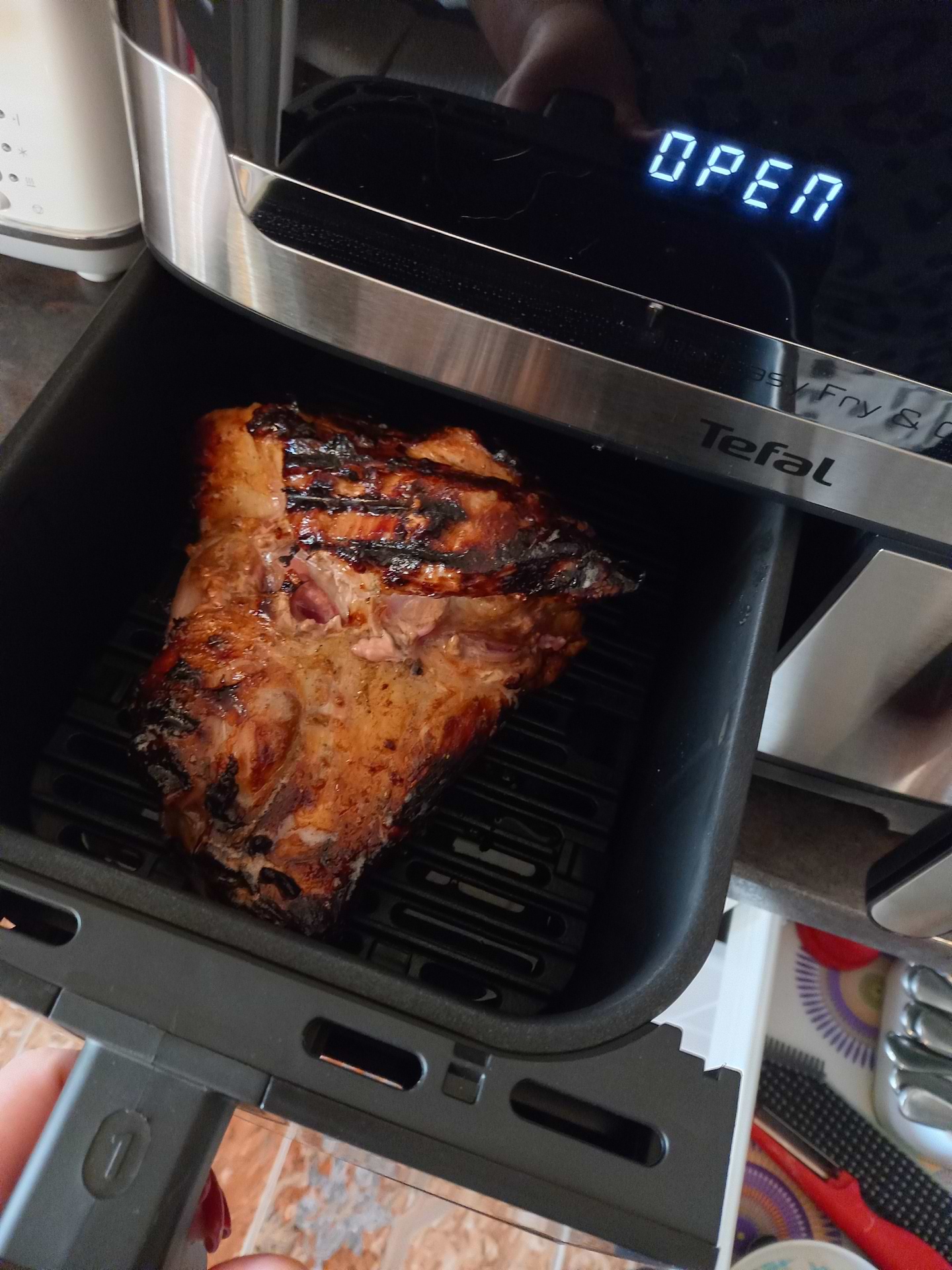Классна функція гриль, яка розігріває попередньо чашу, стейки виходять соковиті (але треба враховувати товщину стейку і відповідно коригувати час приготування). З меншим використанням олії іжа виходить і смачна і корисна. Сподобалась можливість синхронізації часу приготування в обох чашах. Плюсом є можливість миття чаш в посудомийній машині.