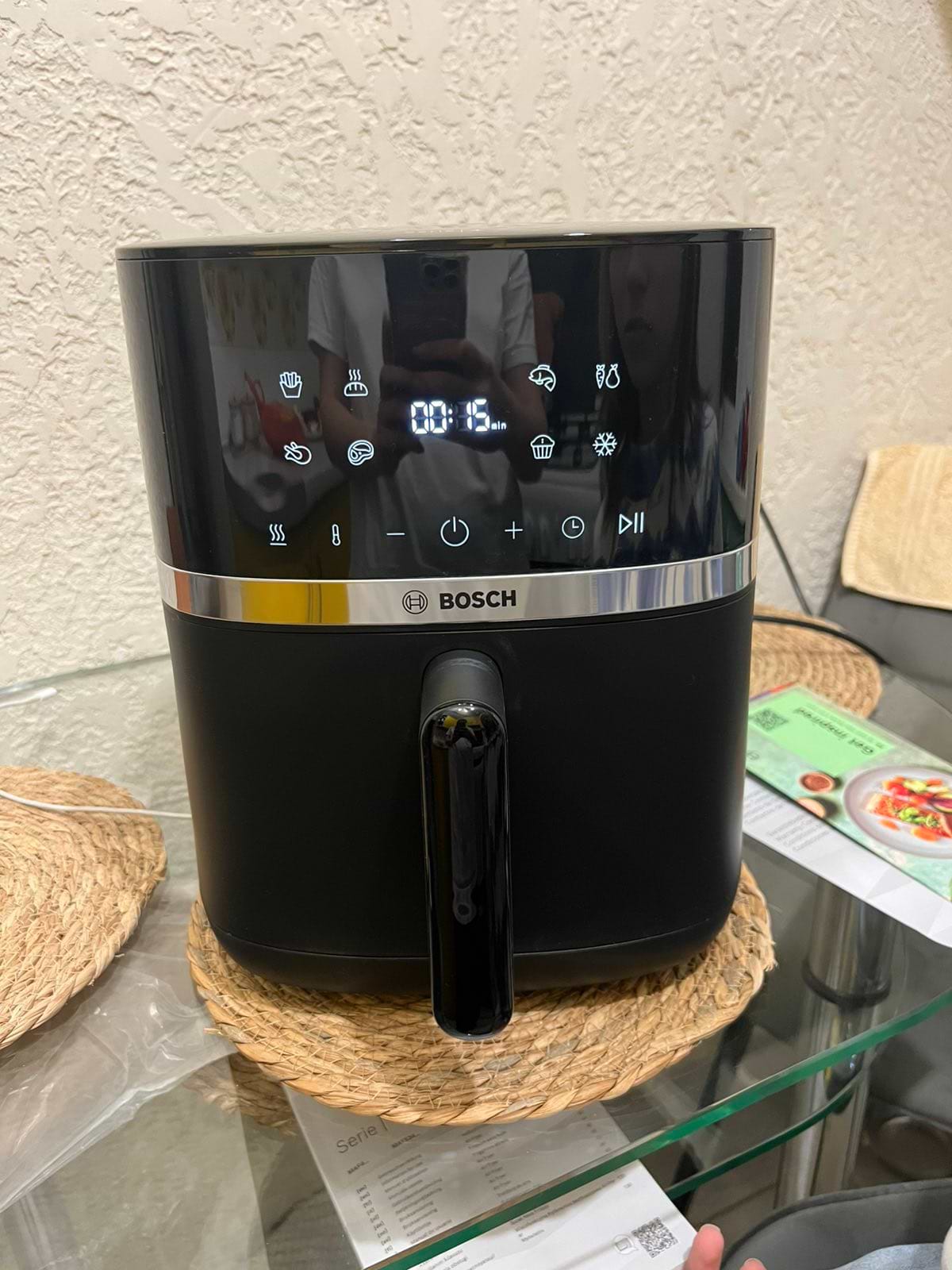 Дуже задоволена покупкой іменно цієї моделі, хоча сумнівний вибір стояв на іншої дешевої моделі, за допомогою консультанта я смогла побачити різницу між німи , Аєрогриль BoschMAF46280 безшумна, с антіпригарним покриттям, с двома тенамі , сенсорное управління .