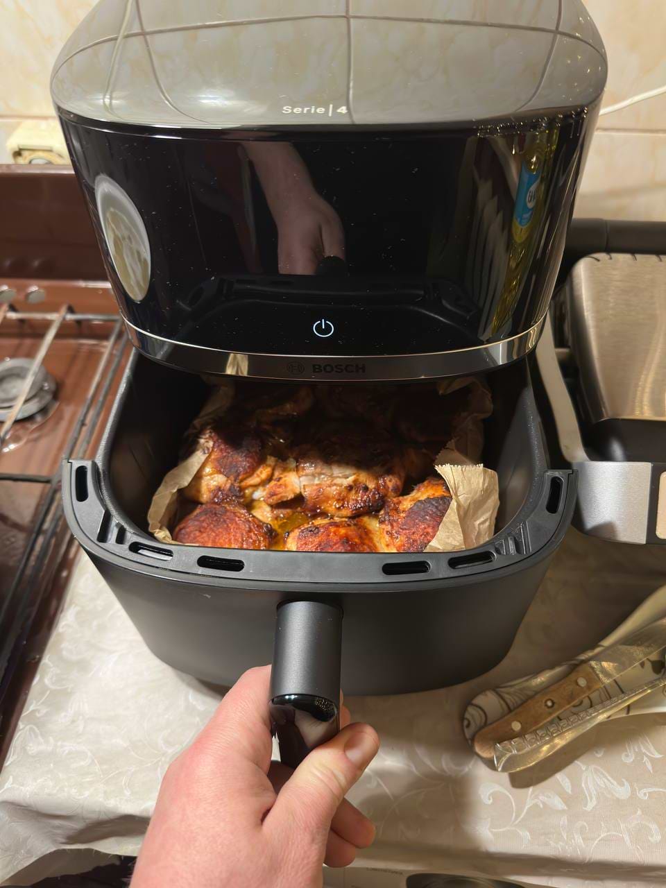 Ця аерогриль від Bosch сподобалась з першого використання. Продуманий дизайн, сенсорна панель реагує легко, не потрібно довго розбиратися з налаштуваннями. Приготування виходить рівномірним: смачне мʼясо, овочі — соковиті всередині та підрум’янені зовні, а заморожені продукти гриль розігріває швидко й без зайвих зусиль.