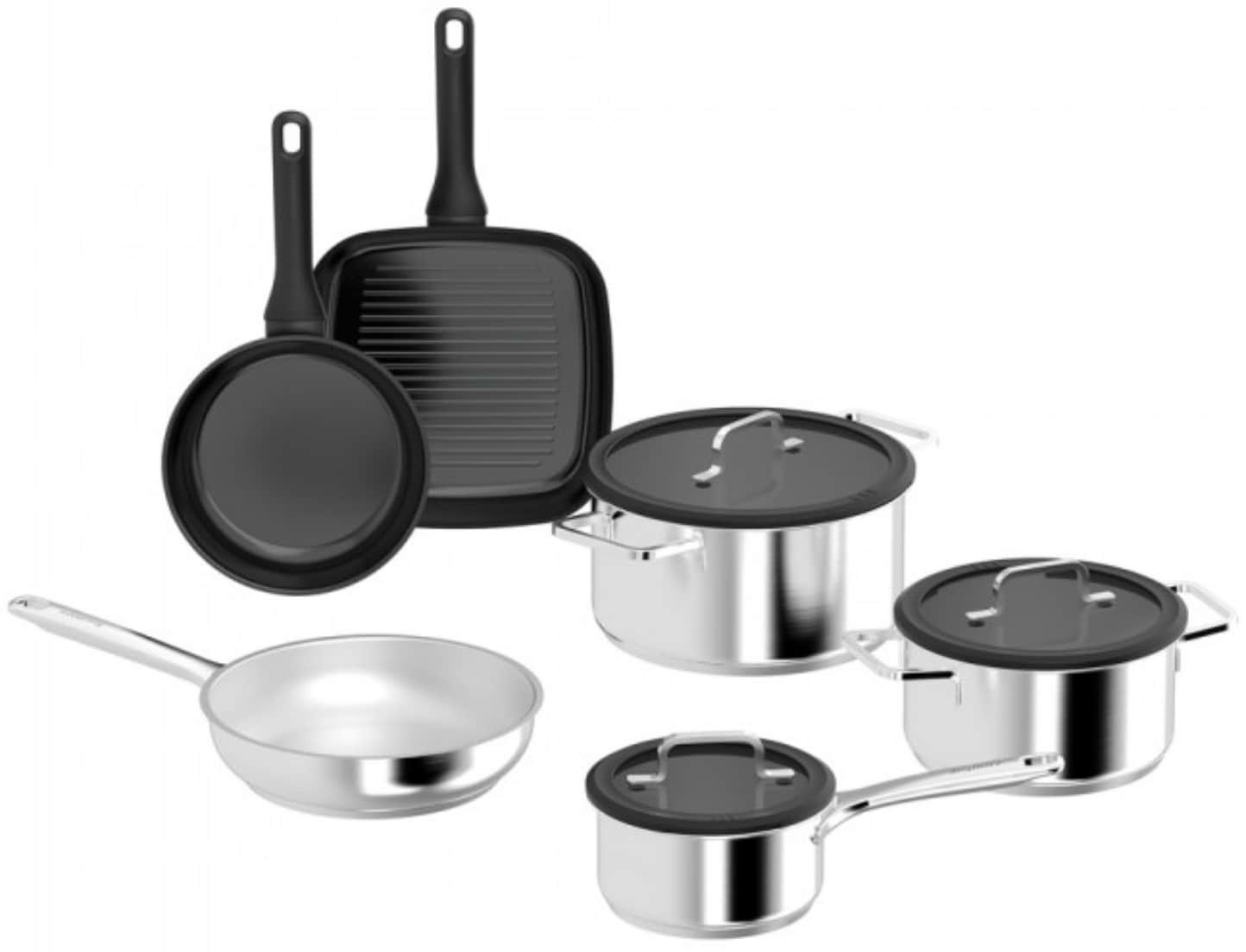 Особенности: корпус предметов изготовлен из переработанной нержавеющей стали и переработанного алюминия с покрытием; 3-слойное капсульное дно обеспечивает быстрое нагревание и равномерное распределение тепла; две сковороды имеют 100% экологичное и безопасное для здоровья керамическое антипригарное покрытие CeraGreen, позволяющее готовить практически без масла (не содержит PFAS); на внутренних стенках кастрюль нанесена шкала объёма; стильные крышки из чёрного тонированного стекла со встроенным воздухоотводом и функцией фильтрации; благодаря стеклянным крышкам можно следить за процессом приготовления; подходят для всех типов плит, включая индукционные; подходят для использования в духовке; термостойкость до 250°C; термостойкость крышек до 180°C; термостойкость сковород с покрытием до 180°C; легко очищаются.