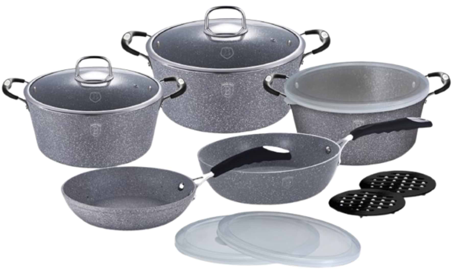 Кастрюля - 20 см/2,5 л, Кастрюля - 24 см/4,1 л, Кастрюля - 28 см/6,1 л, Крышка пластиковая - 20 см, Крышка пластиковая - 24 см, Крышка пластиковая - 28 см, Крышка стеклянная - 20 см, Крышка стеклянная - 24 см, Крышка стеклянная - 28 см, Подставки - 2 шт, Сковорода - 20 см, Сковорода - 24 см