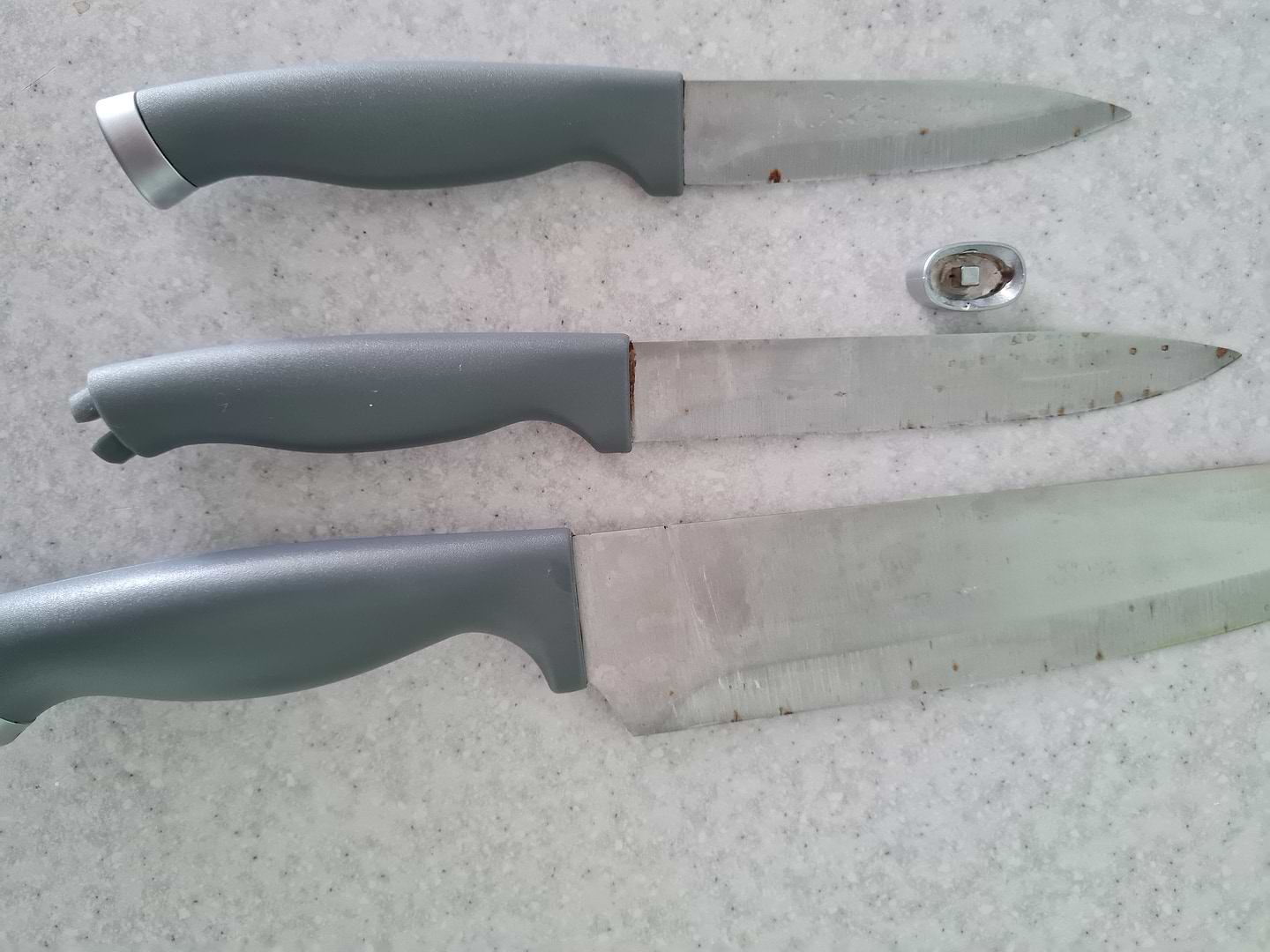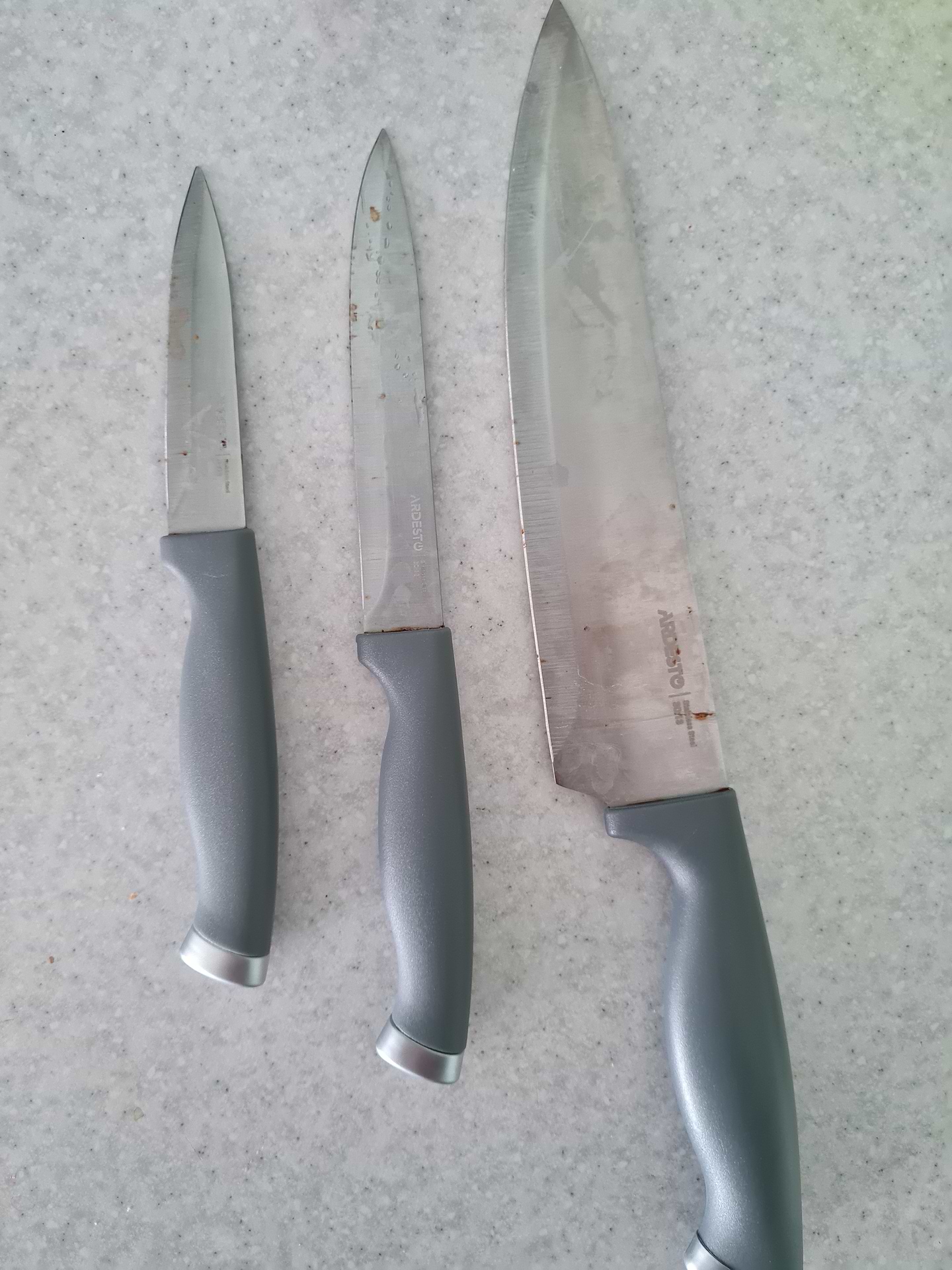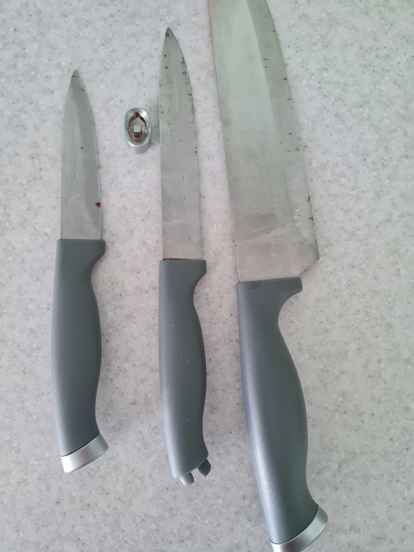 дуже не якісні ножі. купувала 18 липня 2023 р . Вони просто ржавіють. Добавлю фото . зберігала їх в спеціальній підставці для ножів. знизу кожний раз відпадає металева частина. Ножі просто жах. із плюсів те що вони гострі, хоча вони ж нові.