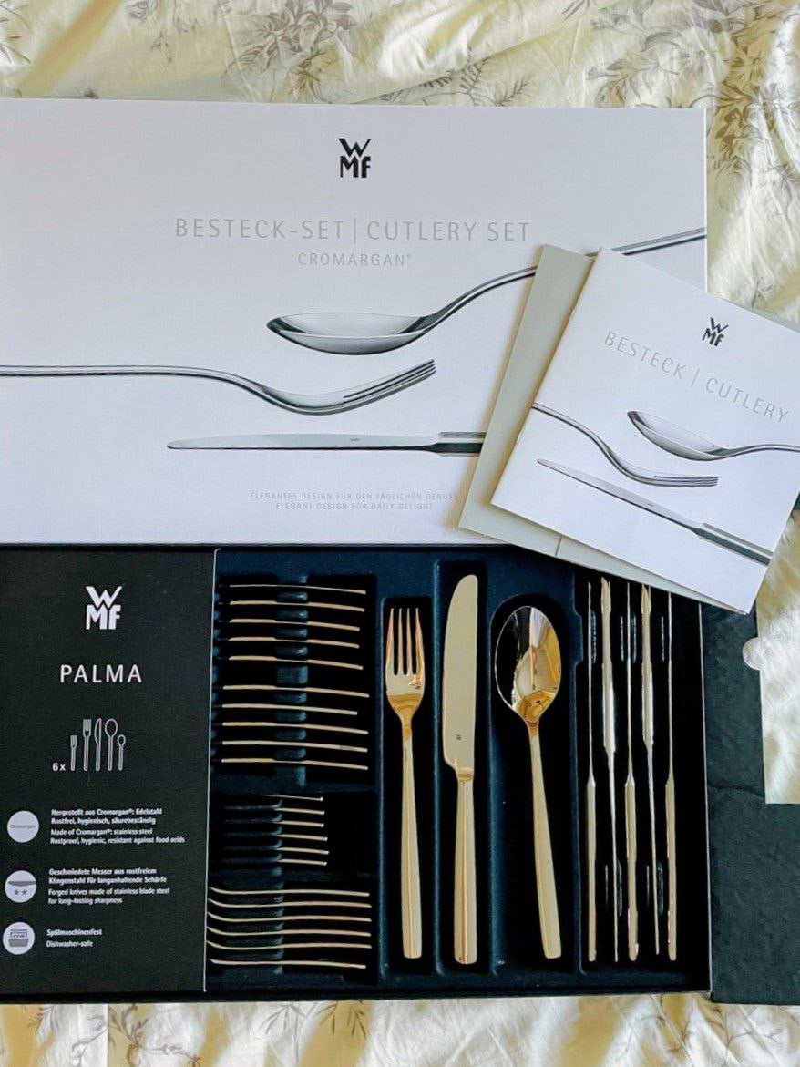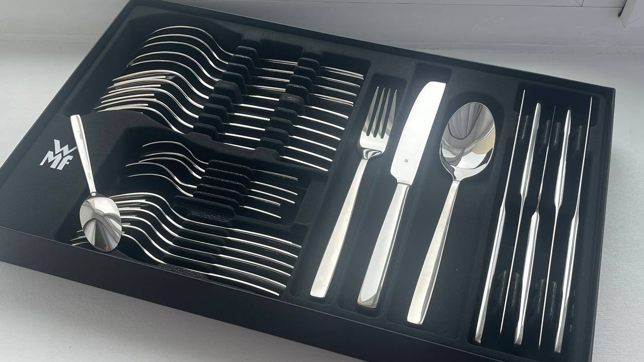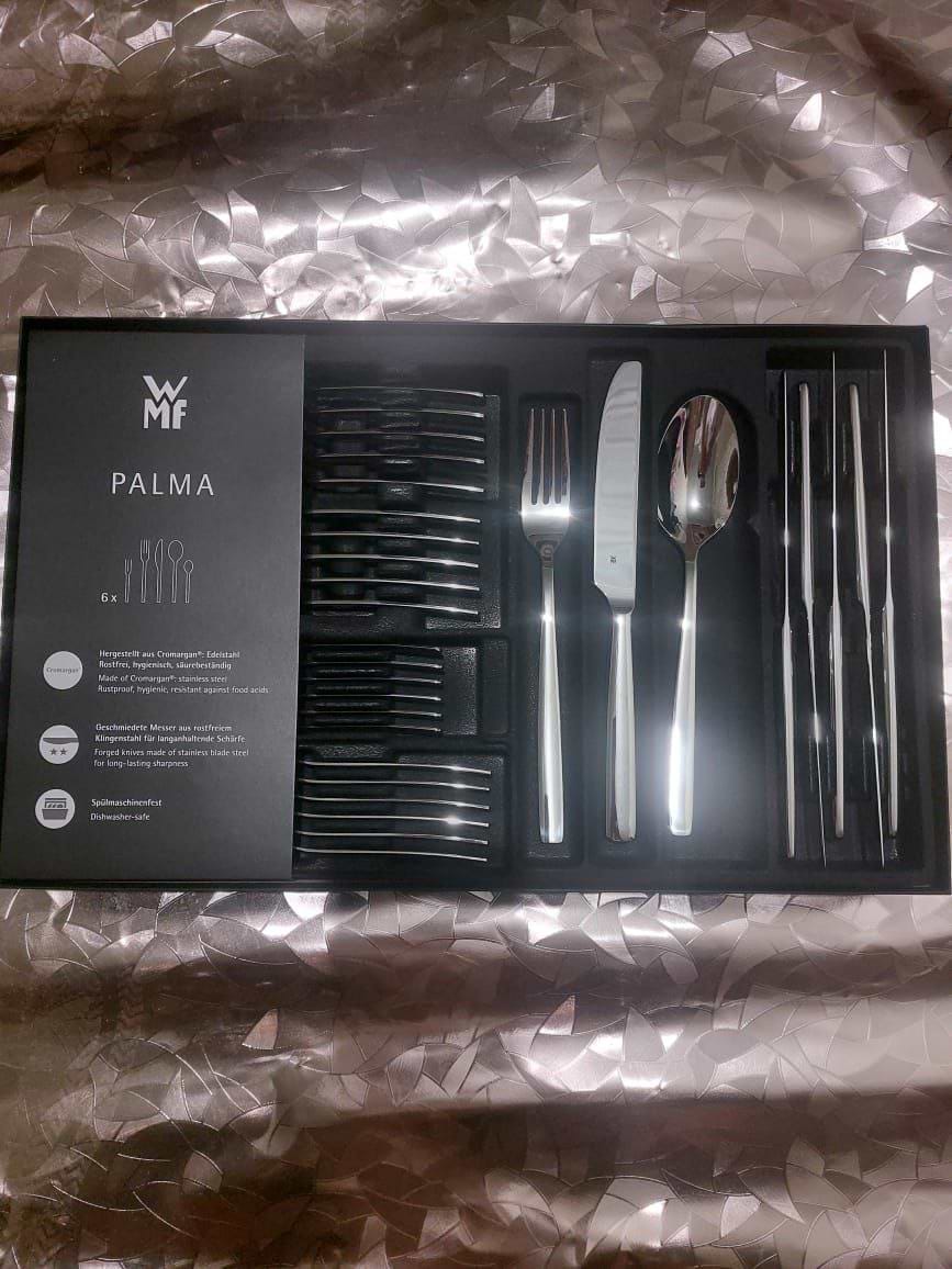 Довго вибирала між різними наборами і не пожалкувала, що зупинилась на WMF Palma. Прибори мають приємну вагу, не гнуться, виглядають дуже охайно. У наборі 30 предметів — ідеально для шести осіб. Дизайн універсальний, підходить як на кожен день, так і для святкового столу.