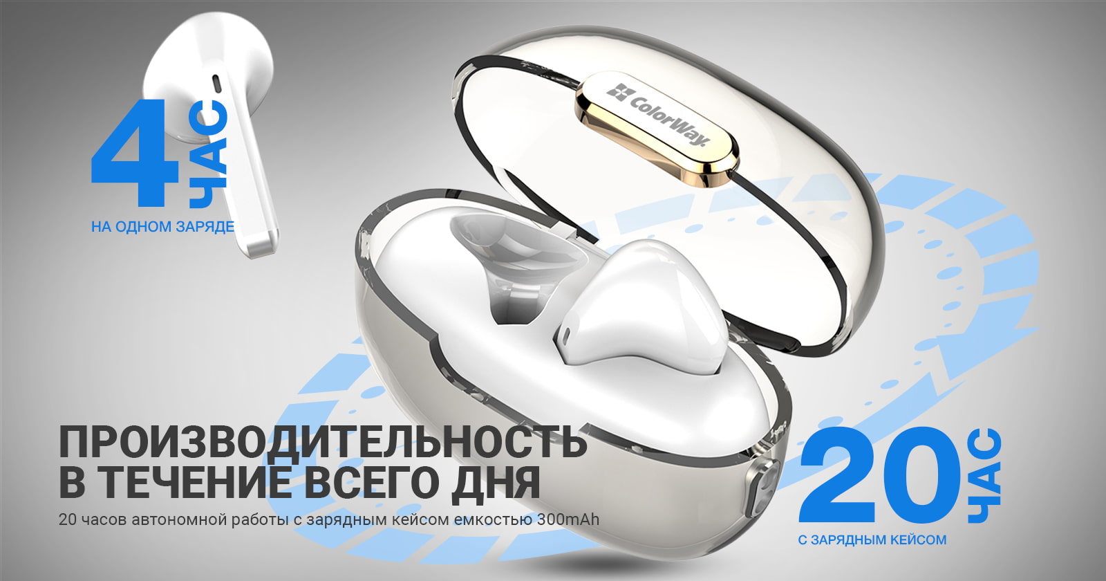 Наушники обладают мощным аккумулятором в кейсе, который обеспечивает до 20 часов автономной работы. Сами наушники без дополнительной подзарядки могут работать до 4 часов непрерывно — идеальный вариант для тренировок, путешествий или долгих прогулок.