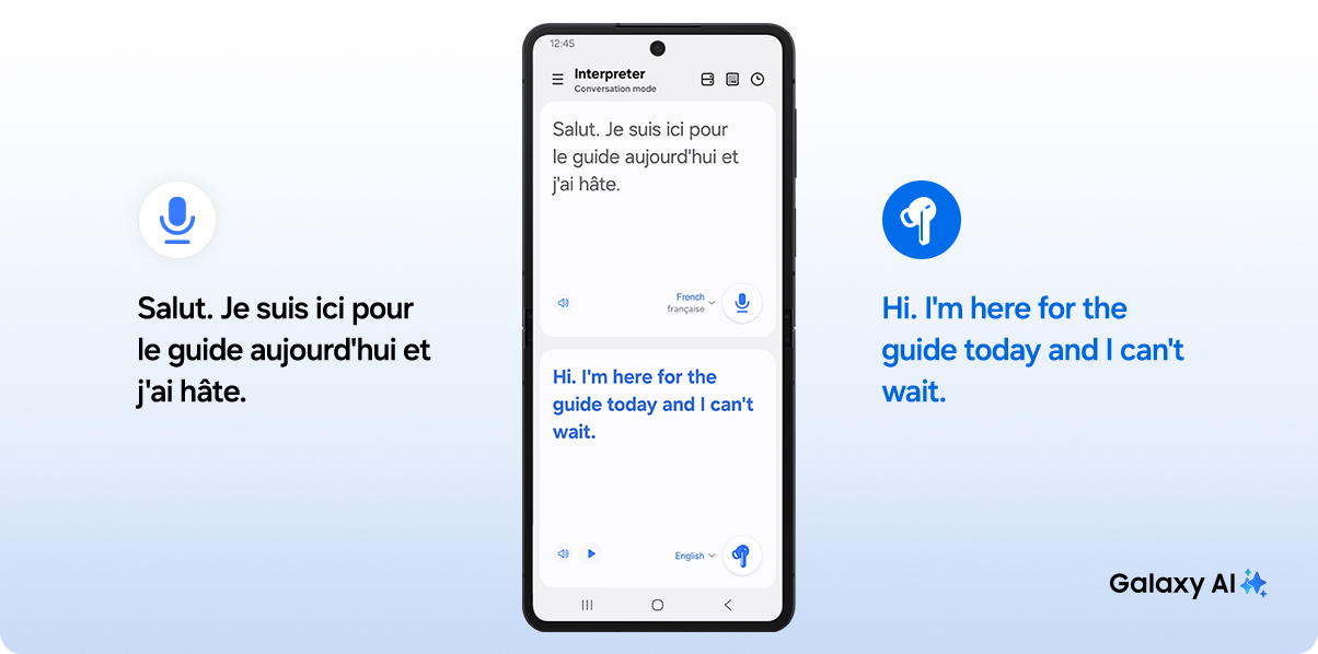 Преодолейте любые языковые барьеры благодаря Galaxy AI Переводчик. Аудиоперевод происходит мгновенно, поэтому вы можете полностью сосредоточиться на собеседнике, даже не глядя на дисплей. Пользуйтесь функцией перевода без необходимости держать телефон в руках.