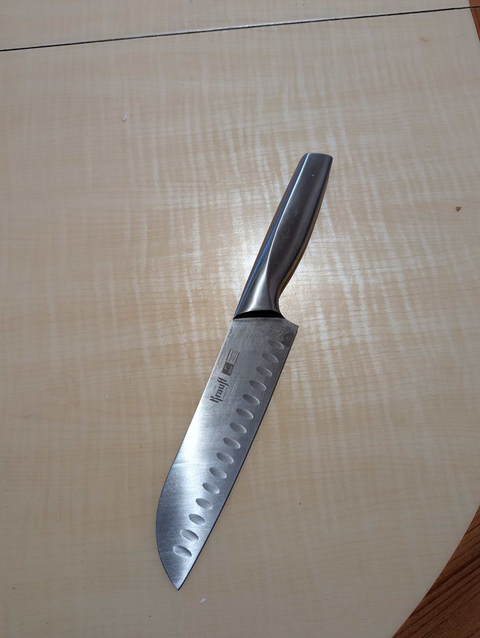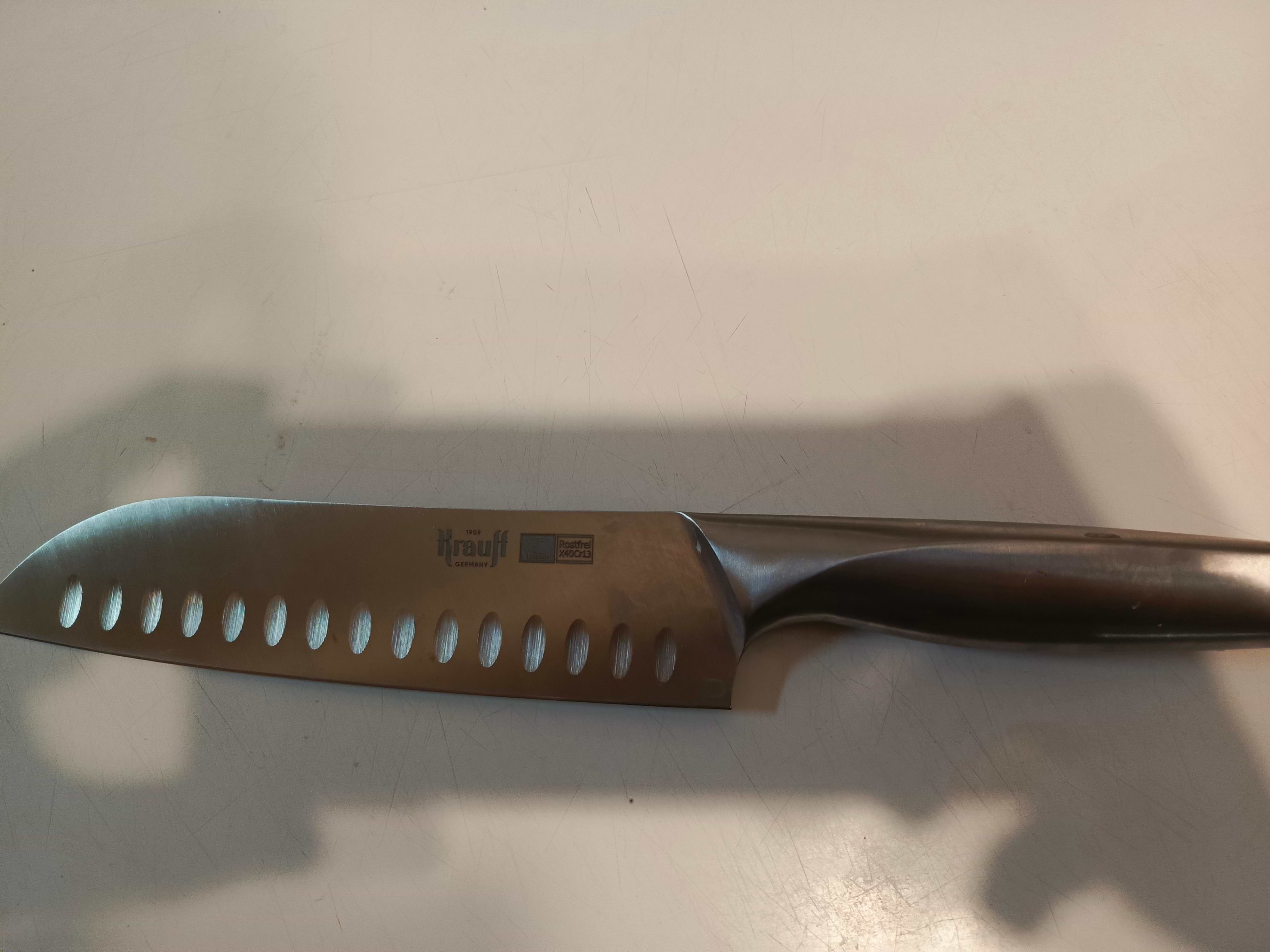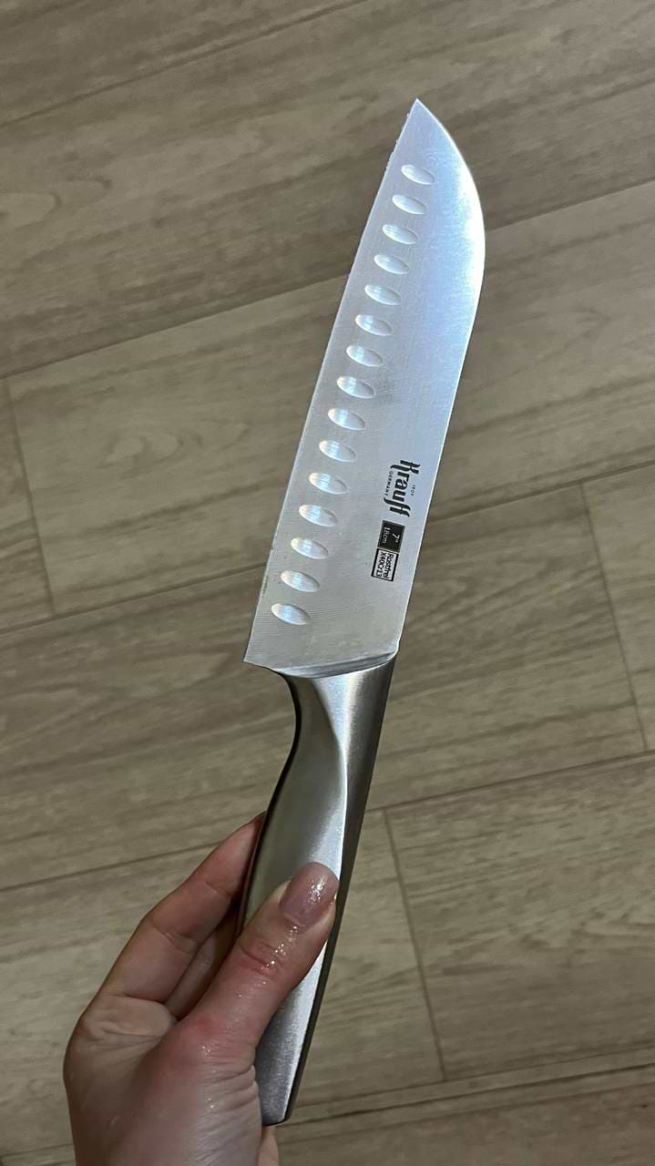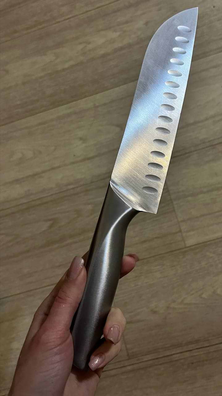 Ніж дуже зручний і добре збалансований, комфортно лежить у руці та не ковзає. Він виготовлений з цільного матеріалу, що додає міцності та надійності під час використання. Лезо гостре, без зусиль ріже овочі, м’ясо й рибу. Виїмки на клинку зменшують прилипання продуктів і роблять процес готування швидшим. Загалом це якісний кухонний ніж для щоденного використання, який повністю виправдовує свою ціну.