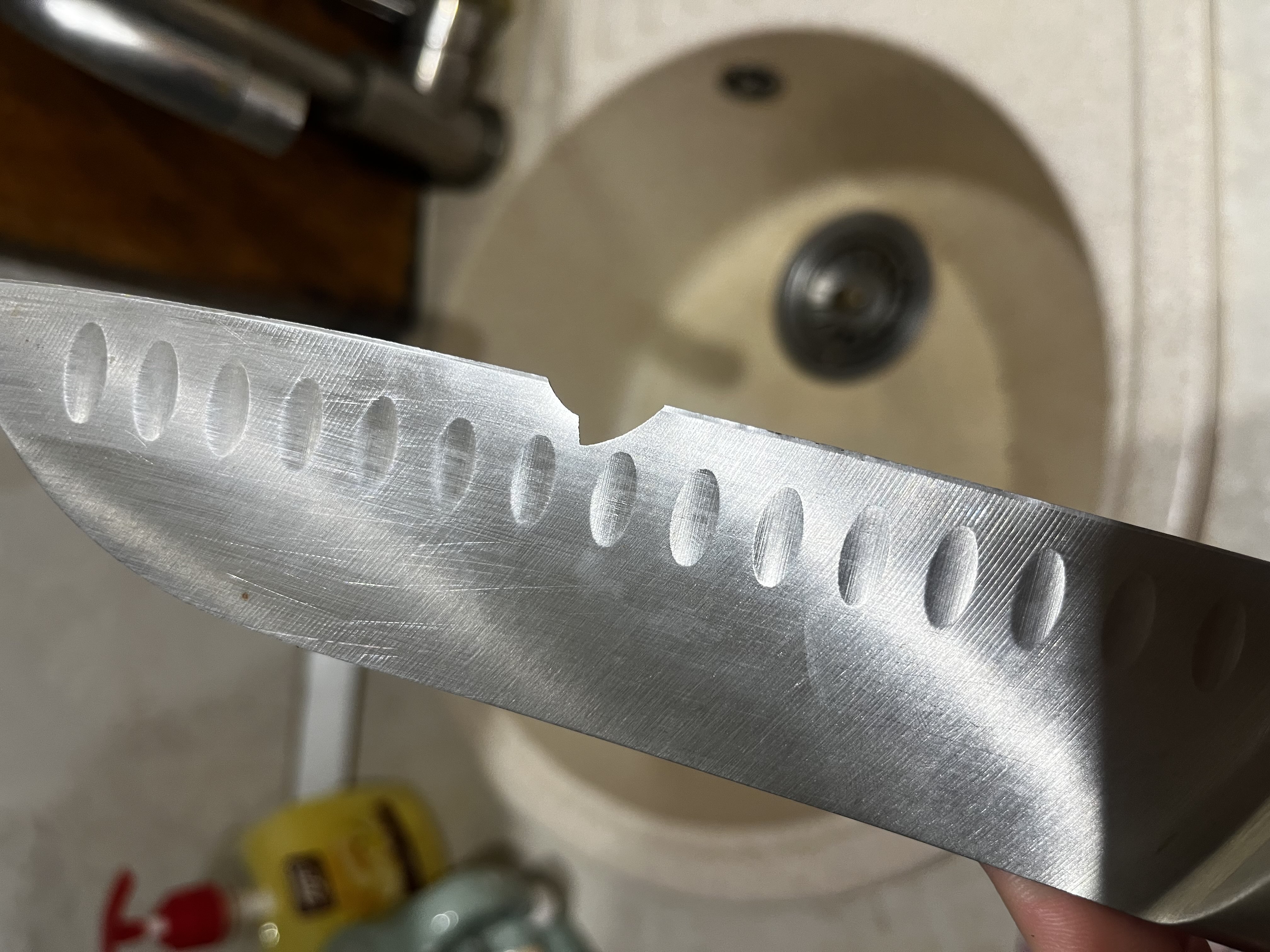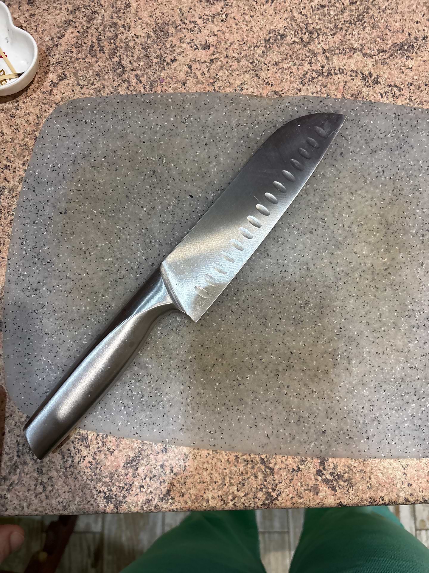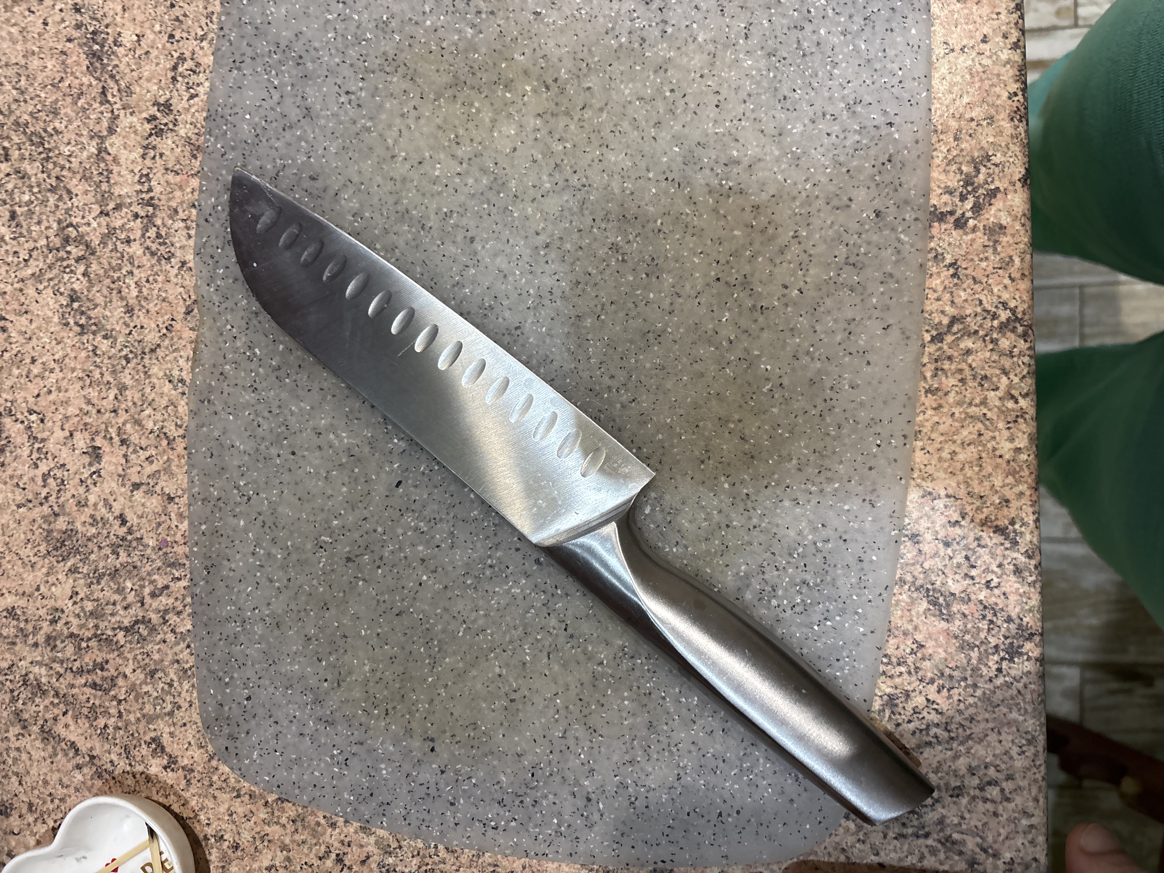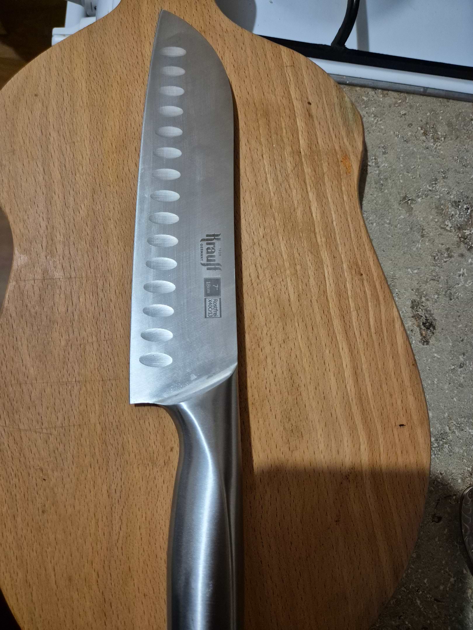 Ніж дуже зручний і добре збалансований, комфортно лежить у руці та не ковзає. Він виготовлений з цільного матеріалу, що додає міцності та надійності під час використання. Лезо гостре, без зусиль ріже овочі, м’ясо й рибу. Виїмки на клинку зменшують прилипання продуктів і роблять процес готування швидшим. Загалом це якісний кухонний ніж для щоденного використання, який повністю виправдовує свою ціну.