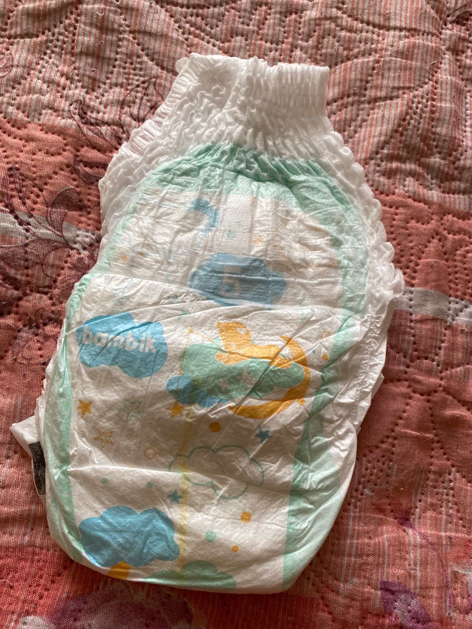 До цього купували Бамбік підгузки,вирішили спробувати трусики. За свою ціну доволі таки непогані. Не натирають, є лінія, по якій видно, чи попісяв син. М'яка резинка. Єдиний мінус - попа іноді залишається вологою. Але вони не протікають і гарно розриваються при зміні, є липка стрічка для зручності. Малюк наш важить 10,5. За розміром підхпдять. Тверда 4.