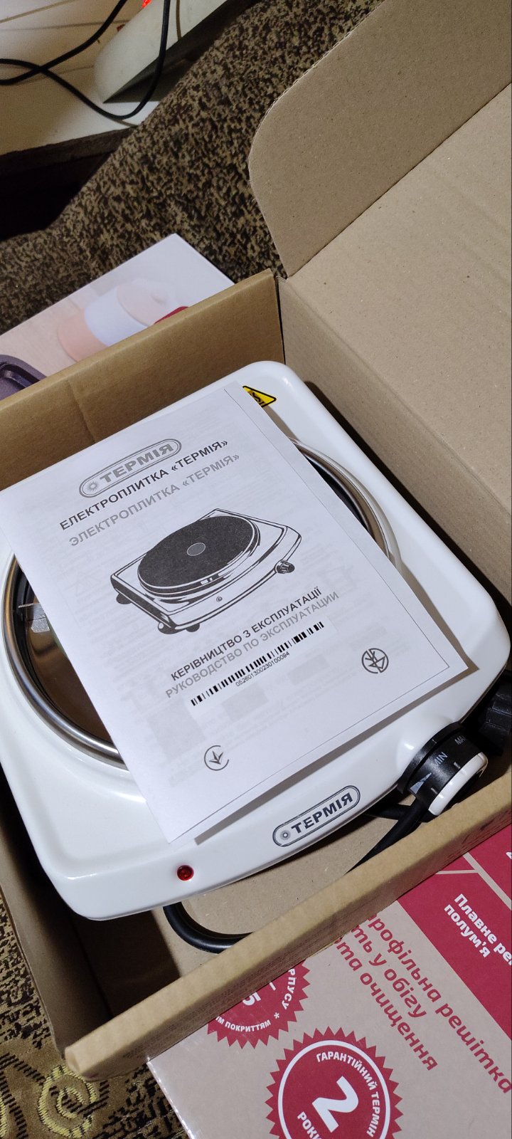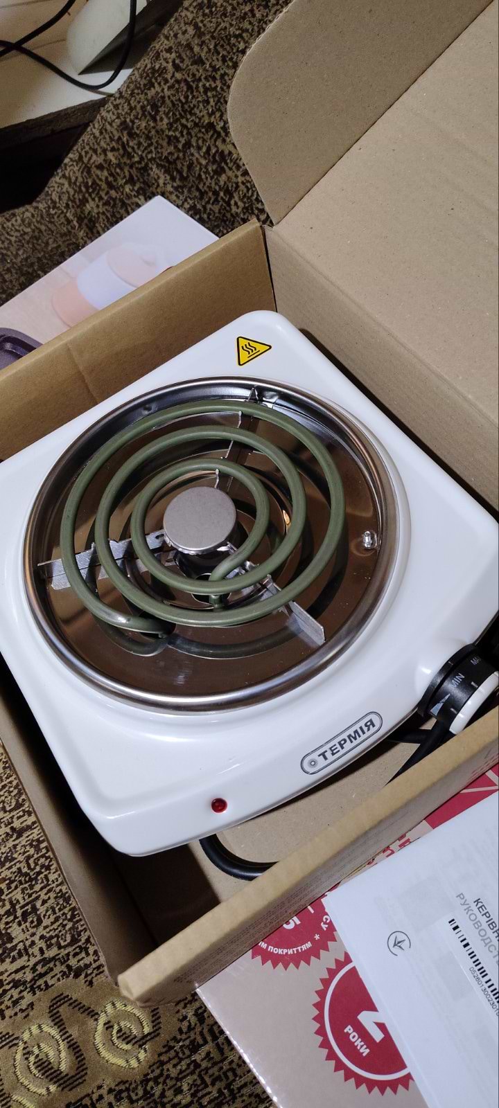 Выбирал себе недорогую настольную плиту, чтоб когда работаешь можно было чайник на улице нагреть, а не бегать постоянно в дом. Термия - украинский бренд, сделали на славу) Гарантия от производителя идет 1 год. Быстро нагреваться. Температуру можно регулировать механически. Компактная по размерам и достаточно легкая.