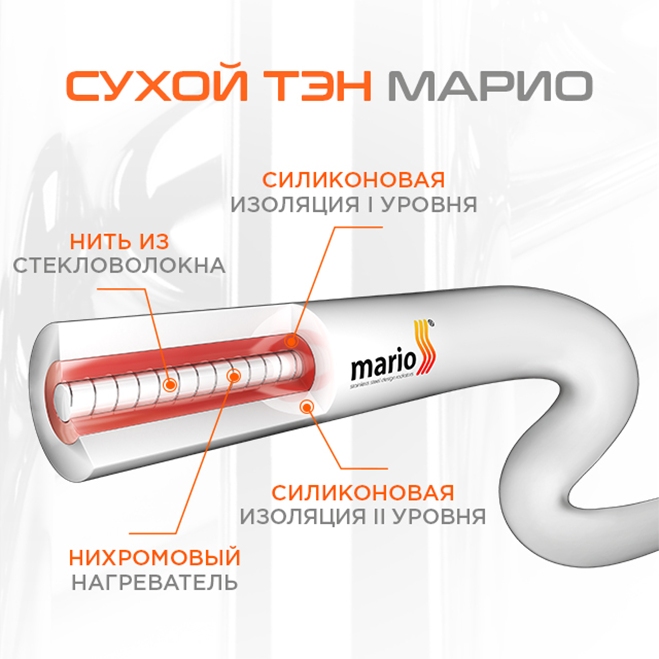 Полотенцесушитель с сухим нагревательным элементом не требуют для работы жидкого теплоносителя или дополнительно установленного ТЭНа. Внутри трубы находится специальный нагревательный кабель, в основе которого нихромовый нагреватель и теплоаккумулирующие шары. Это обеспечивает равномерное распределение тепла и точный контроль температуры.