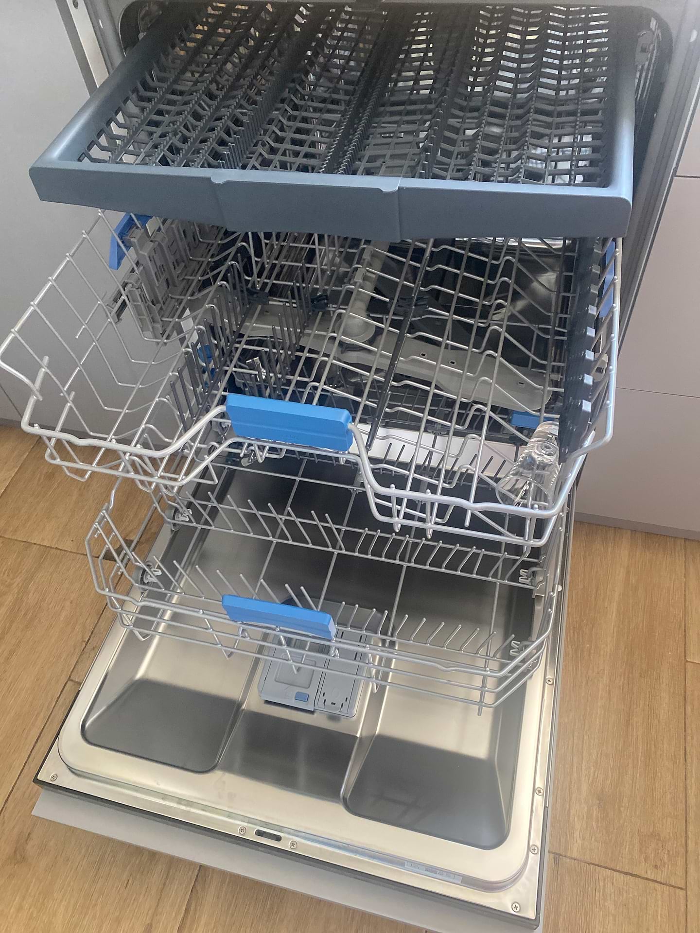 Дуже зручно, що є верхня полиця для столових приборів — все розкладається акуратно і краще промивається. Також подобається функція автоматичного відкриття дверцят — після миття посуд краще висихає