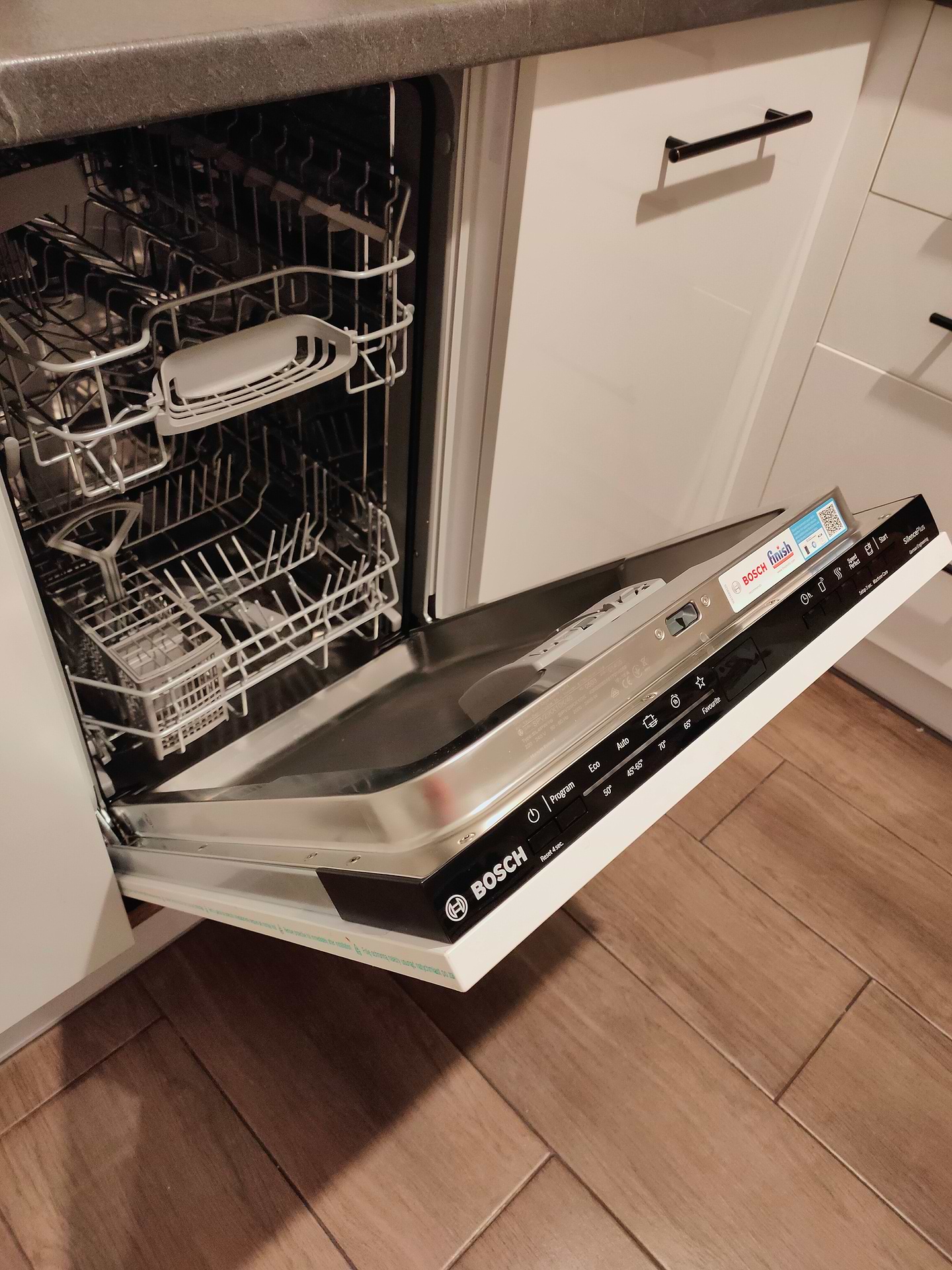Незамінний помічник на кухні, гарно миє та сушить посуд. Сподобалося, що в середній корзині стоїть два коромисла які росповсюджують воду, це краще вимиває посуд, який стоїть в кутку. Працює тихо, класна функція Луч на підлозі- інфекція роботи. Але потрібно мабуть було брати з третім верхнім кошиком для виделок та ложок, в цій моделі їх потрібно вставляти в окремий кошик, який займає місце в нижній корзині. Хімією для мийки користуюся фірми Фініш, яку постійно купляю в Комфі, це найкраща, спробували багато варіантів.