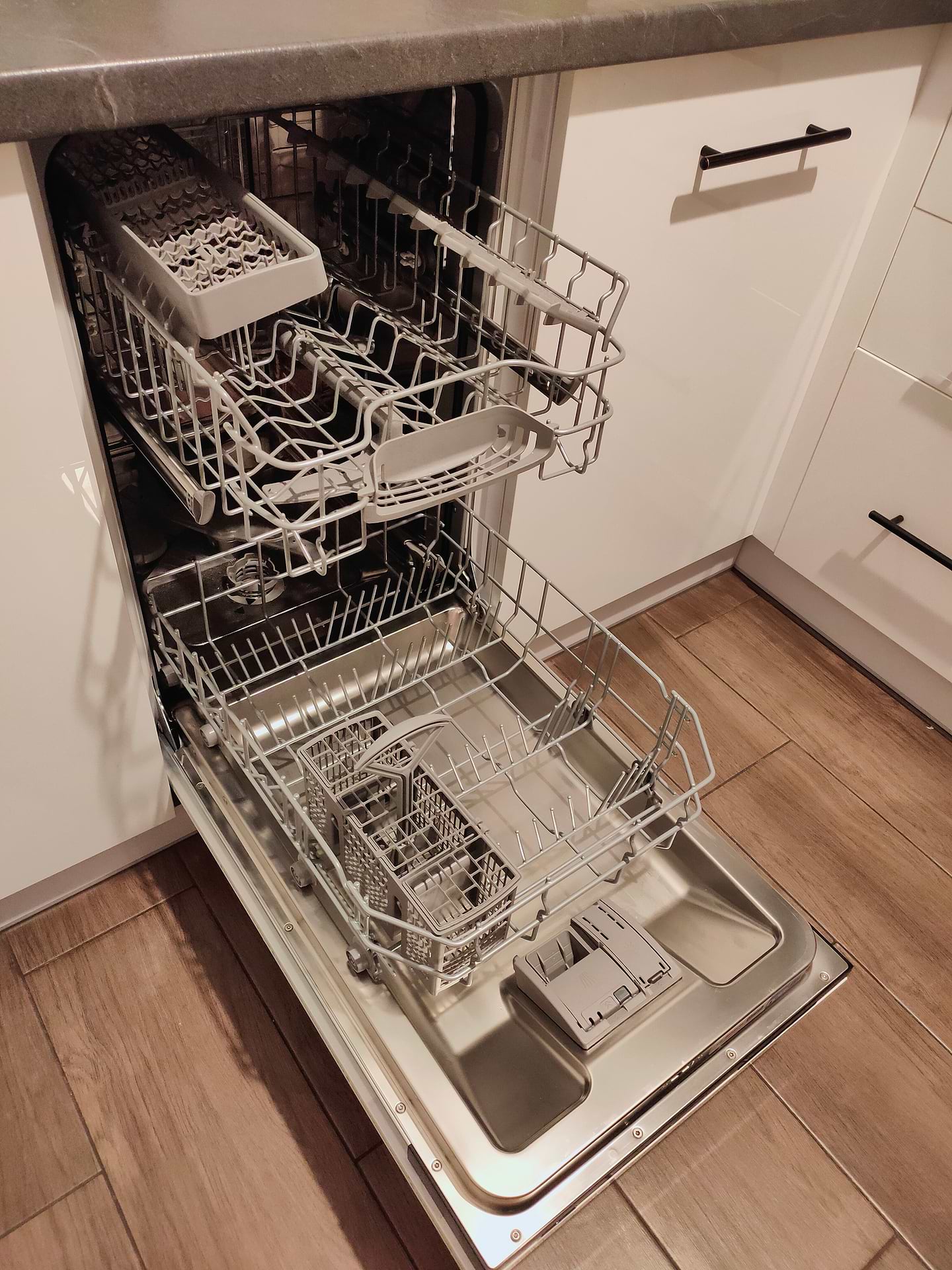 По окончанию мытья, открываете дверку и ждёте буквально минут 15-20 и достаёте идеально чистую, сухую посуду.