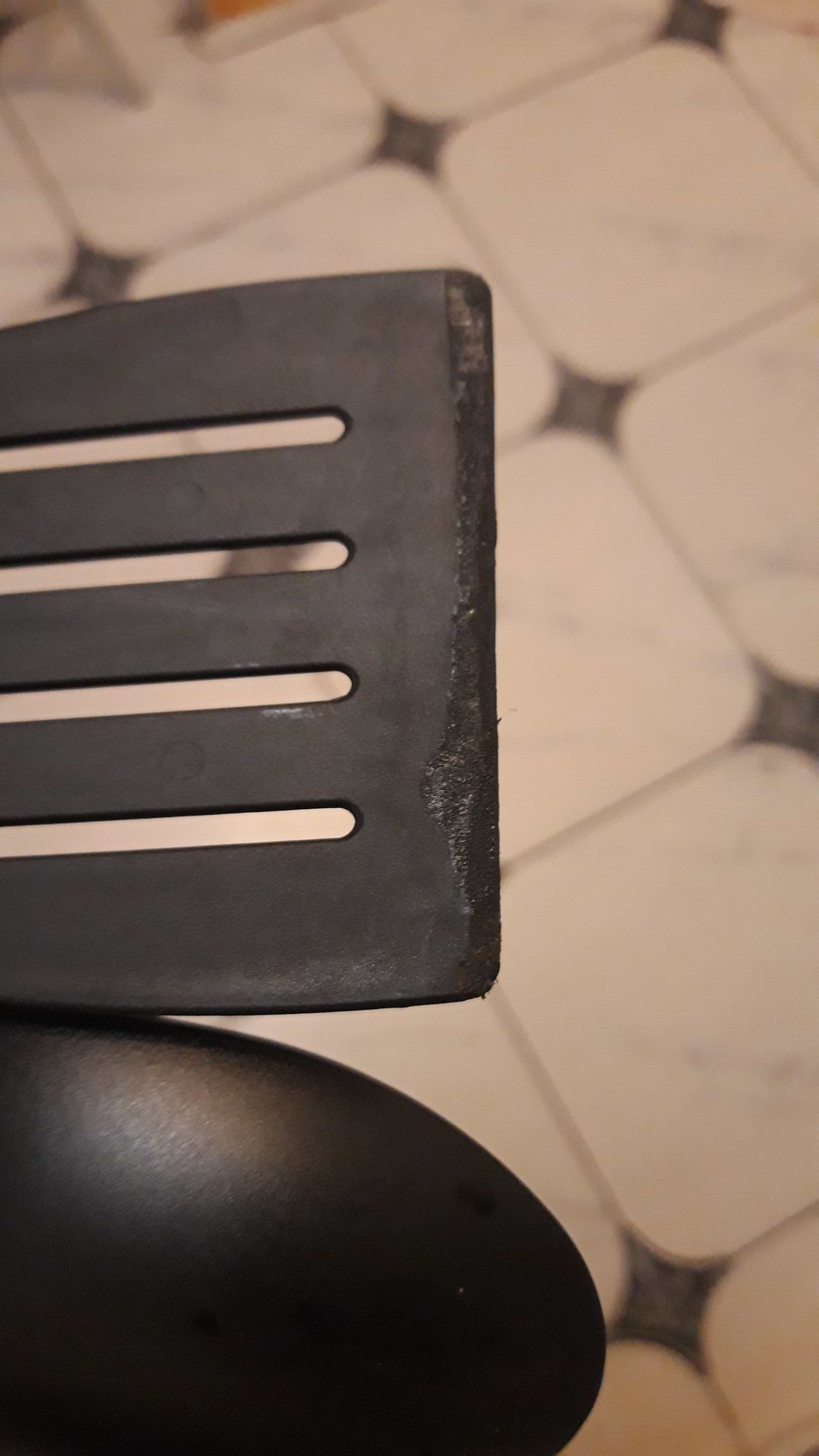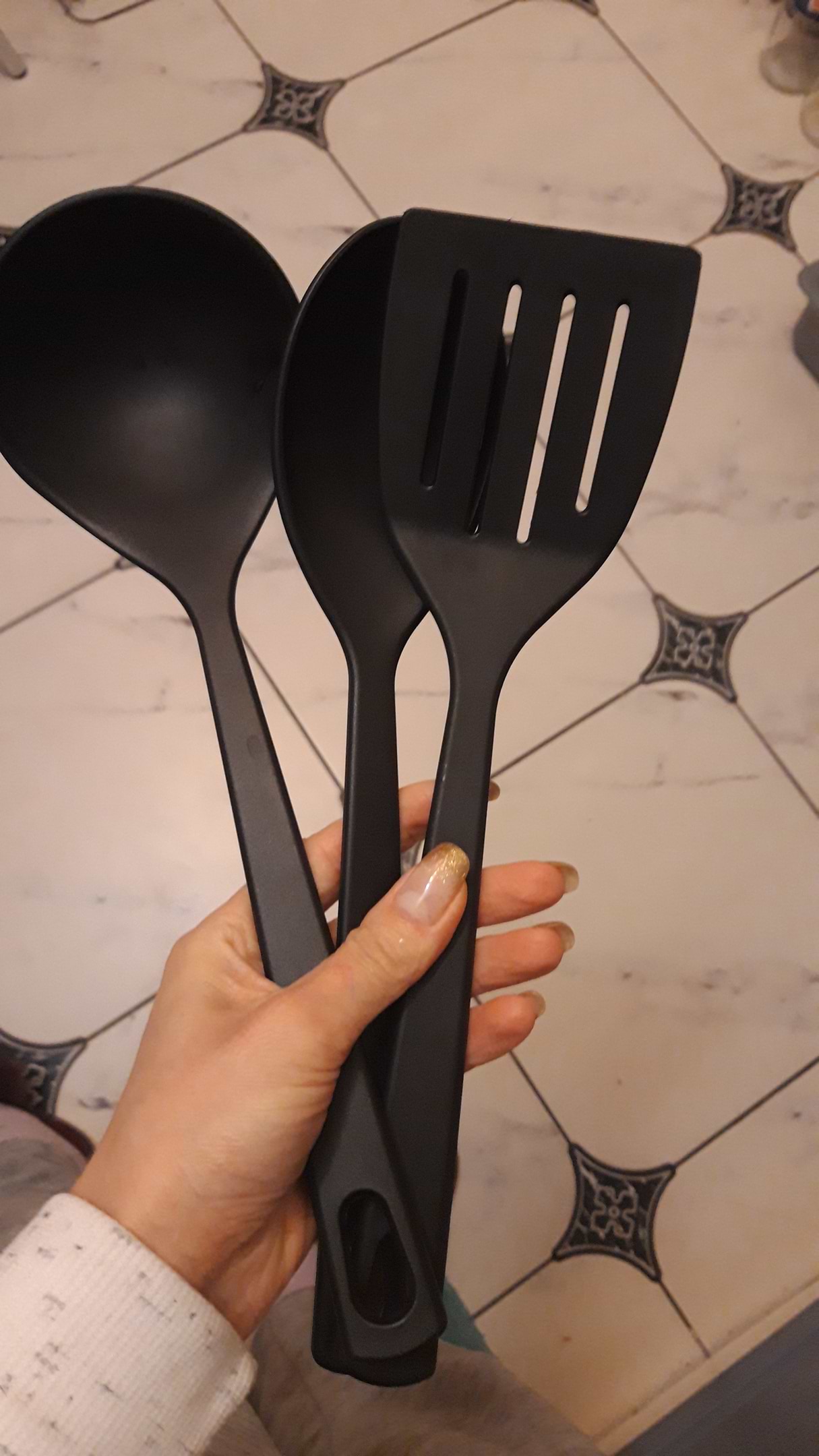 Половину стоимости оплатила бонусами, что вдвойне приятно. Качество материала среднее. Запаха нет, моются прекрасно, можно подвесить, есть отверстия. Лопатка после нескольких использований и после того как сын долго держал ее на сковороде немного подплавилась. Но видимо это бич лопаток, с моей прошлой было тоже самое. Ну в общем довольна