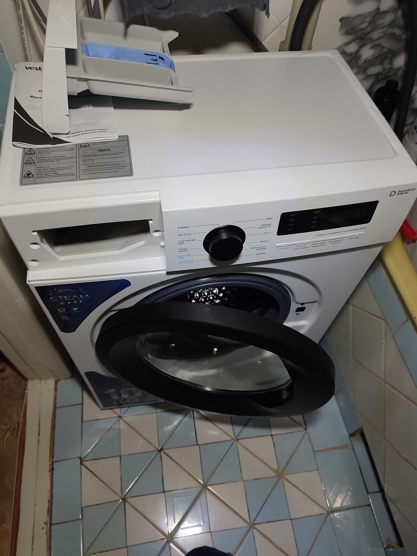 Доставили вчасно в квартиру, перше прання пройшло нормально, відносно тихо працює.