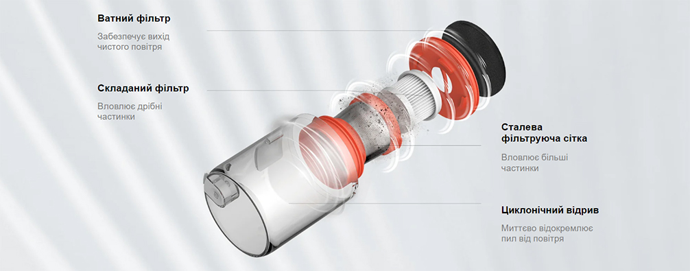 Современная циклонная технология с многослойным фильтром эффективно отделяет пыль и мусор от воздуха, направляя их в специальный отсек. Фильтр задерживает до 99% мелких частиц, включая пылевых клещей, грибковые споры и плесень, обеспечивая чистый воздух без повторного опыления. Фильтрующие элементы можно мыть, что повышает их производительность и уменьшает необходимость в регулярной замене.
