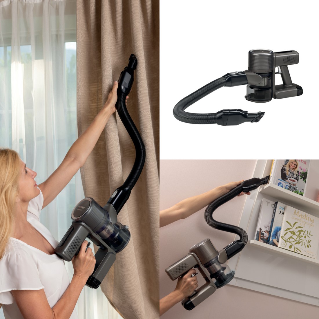 Гибкий шланг пылесоса предоставляет больше свободы при уборке, позволяя легко комбинировать его с щеткой для пыли или щелевой насадкой. Это идеальное решение для уборки книжных полок, узких мест за радиаторами и других труднодоступных зон.