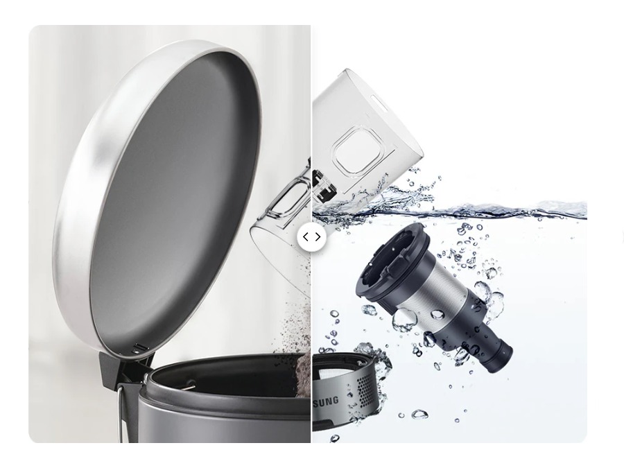 Samsung Jet 65 обладает многослойной системой фильтрации, которая задерживает около 99% пыли и аллергенов животного происхождения. Большие частицы пыли останавливают главный циклонный фильтр и металлическая решетка, более мелкую пыль собирают микрофибра и Jet Cyclone, а наименьшие частицы пыли задерживает фильтр мелкой пыли.