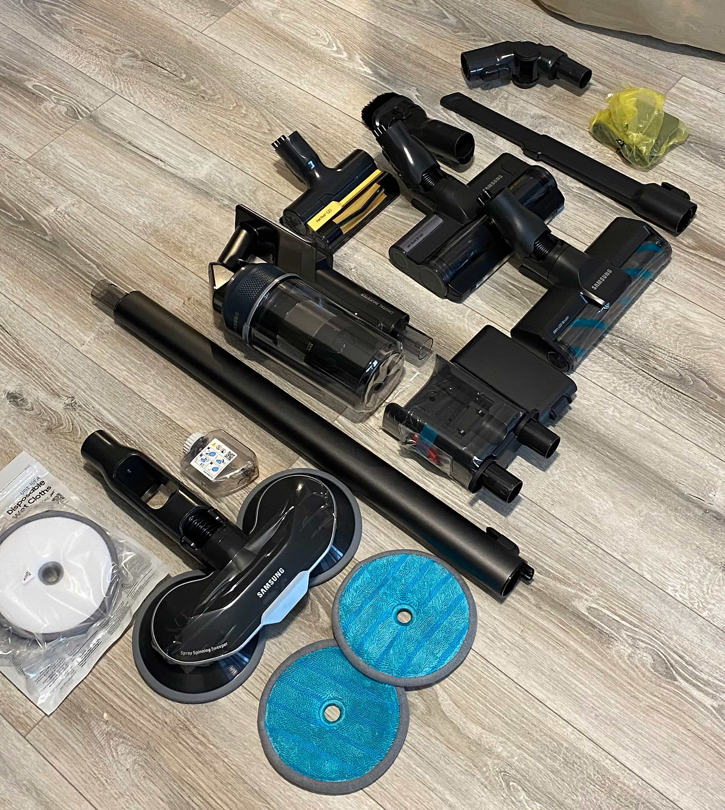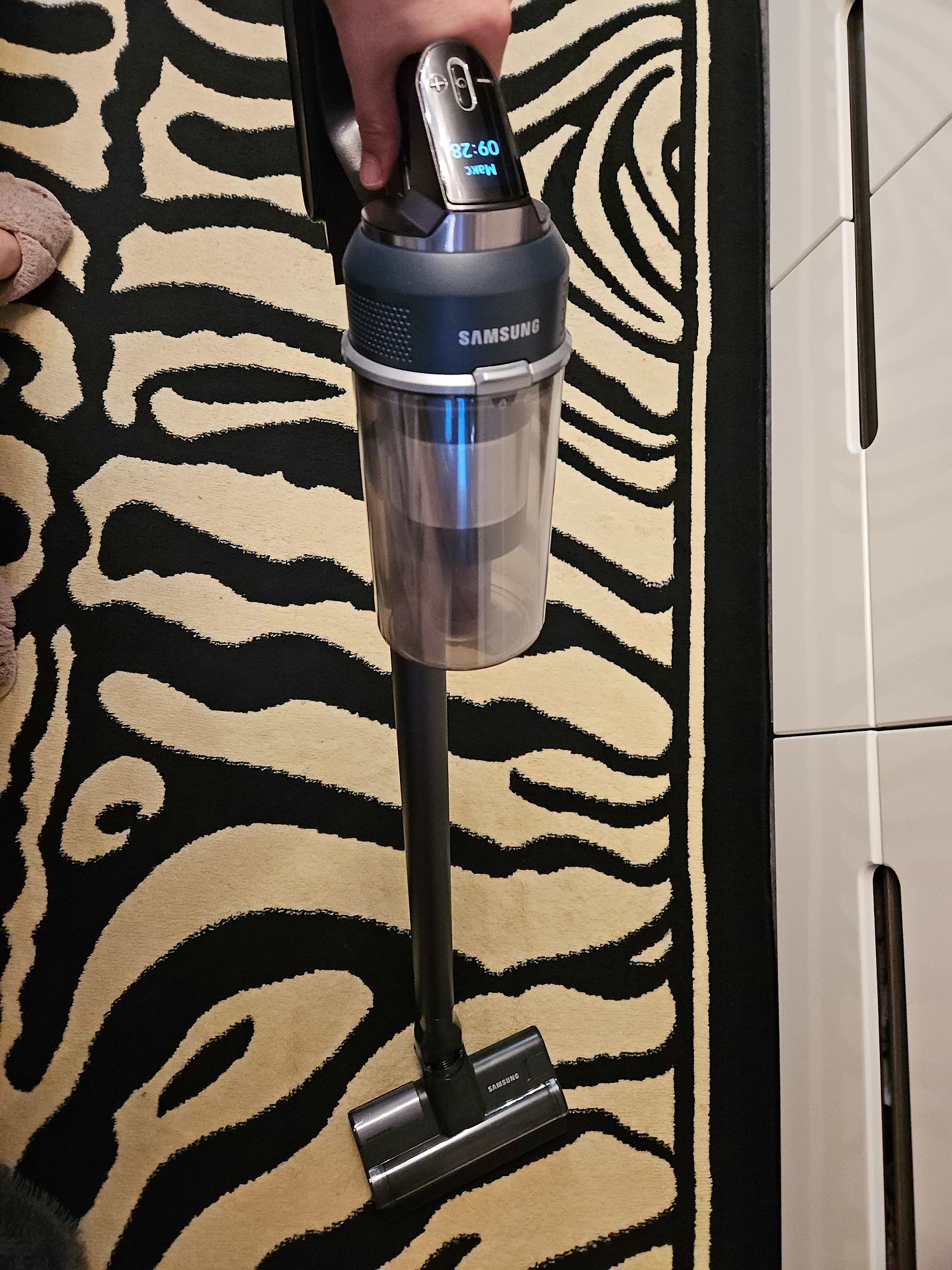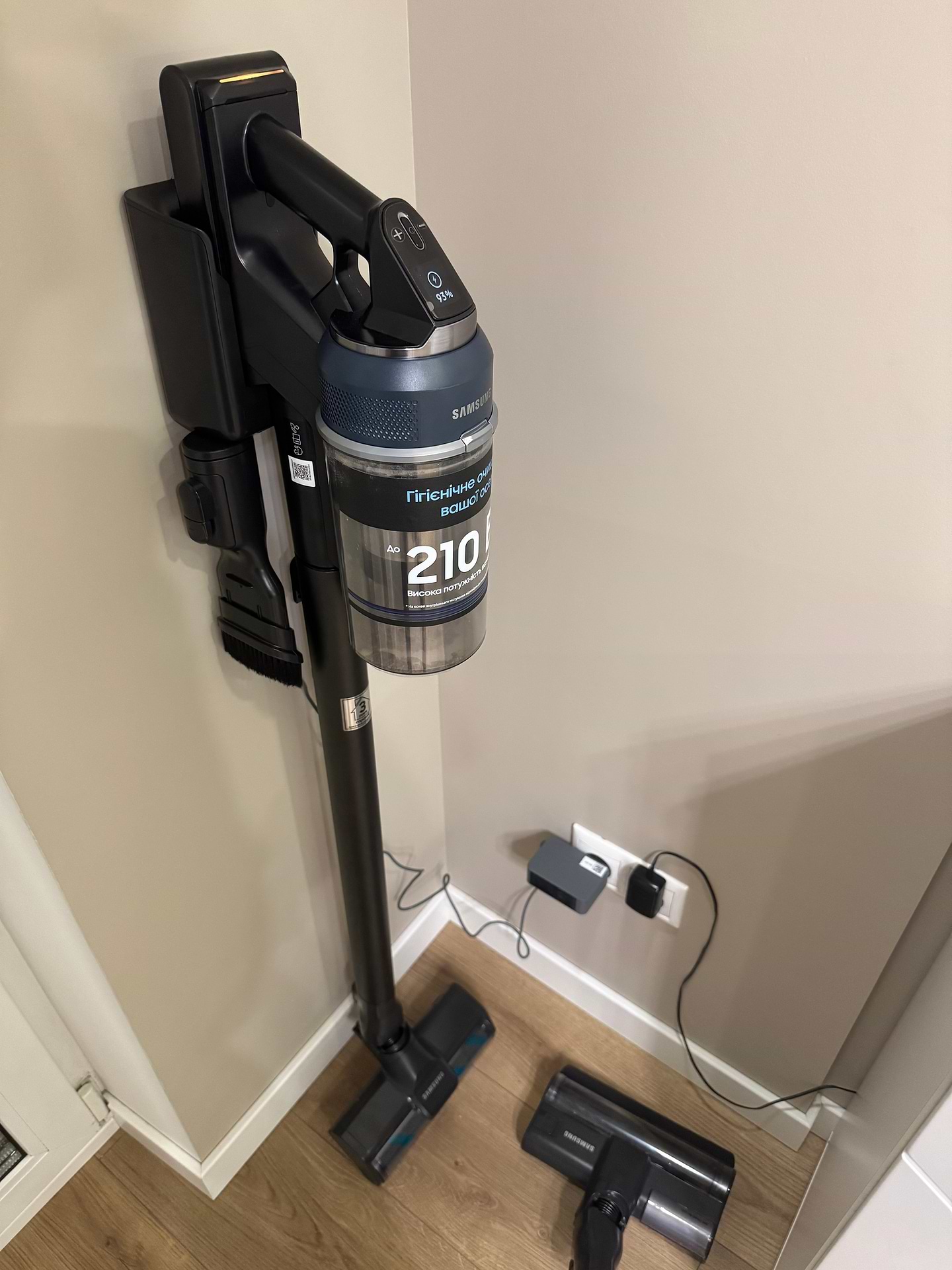 Чудовий вертикальний пилосос! Довго вибирала, бо сумнівалася між іншими брендами, але вибрала цю модель Самсунг і абсолютно не шкодую! Дуже потужний, чудово справляється з нашим килимом навіть на середній швидкості (звичайним полососом відчистити килим було важко). Зручно тримати в руці. Легко розбирається, легко змінюються насадки. Якісні матеріали, гарний пластик. Дисплей показує кількість хвилин , доступних до використання у різних режимах. Досить тихий, але не можу сказати, що він безшумний. На максимальній швидкості досить голосно працює. Щітка з підсвіткою- це просто вау, вся родина випробувала і всім дуже сподобалось. Щітка для збору пилу делікатно визбирує пилюку на підвіконнях, меблях, поличках. Щітку для вологого прибирання ще не випробовували, але впевнена, що вона теж класно працює. Всім, хто сумнівається, раджу дану модель. Дякую Комфі за чудовий сервіс!