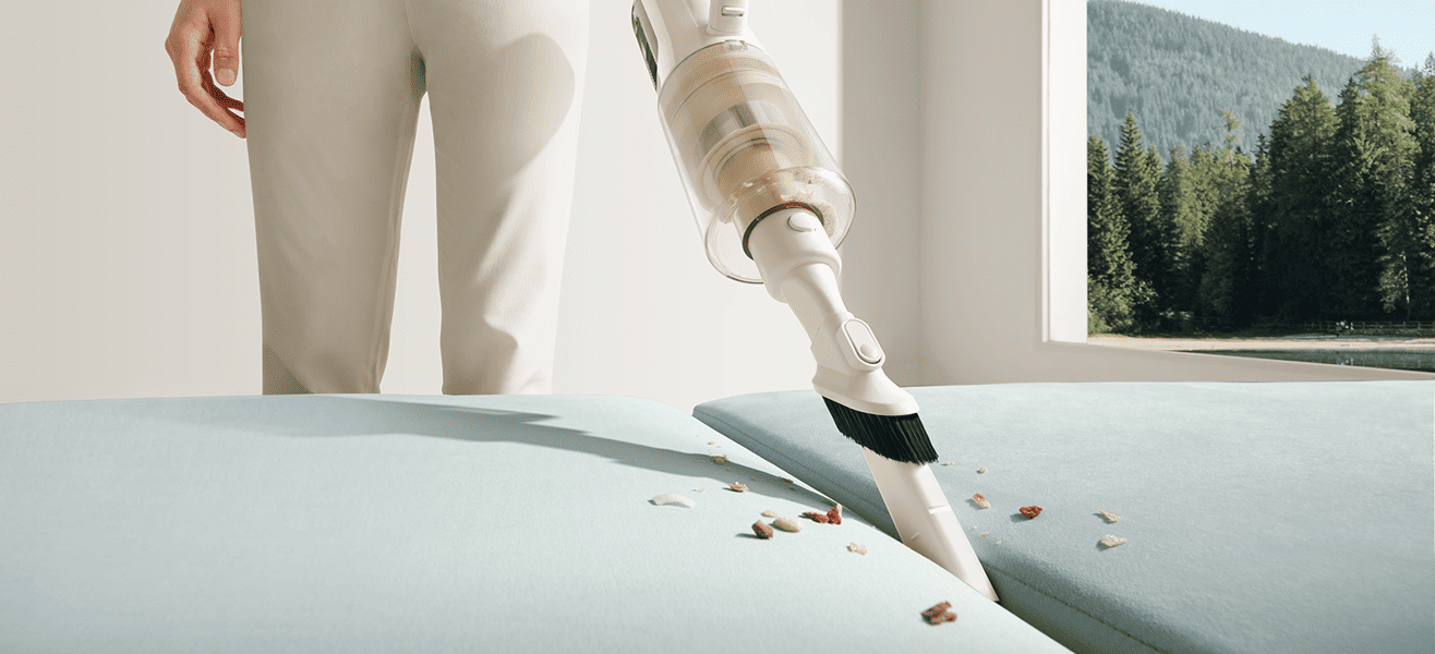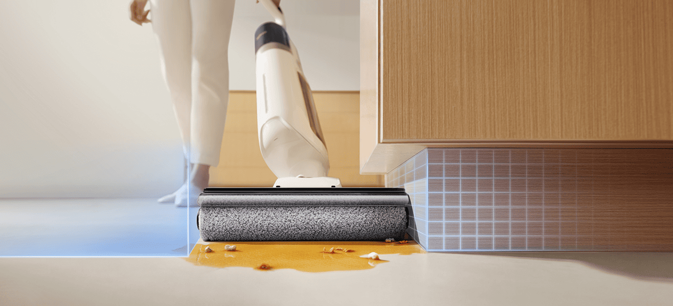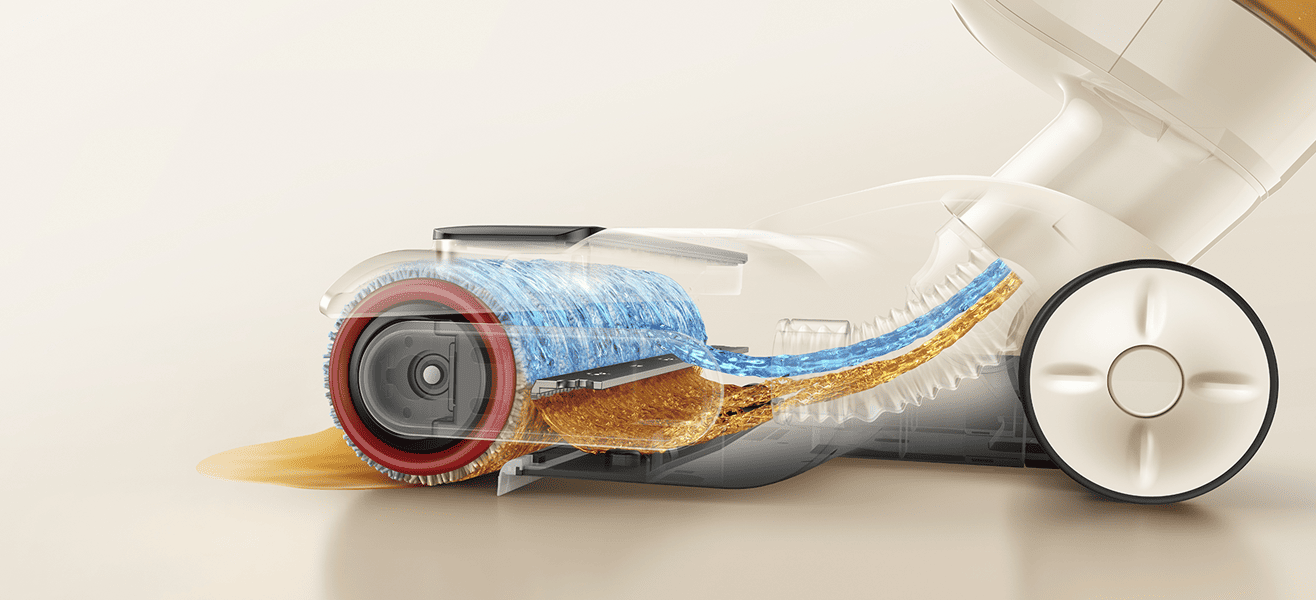 Корпус пылесоса наклоняется на 180°, что помогает дотянуться вглубь мебели. Система Liquid Locking сохраняет мощность даже при наклоне. Щётка справляется с мусором в узких проходах и может проникать на глубину до 8 см.