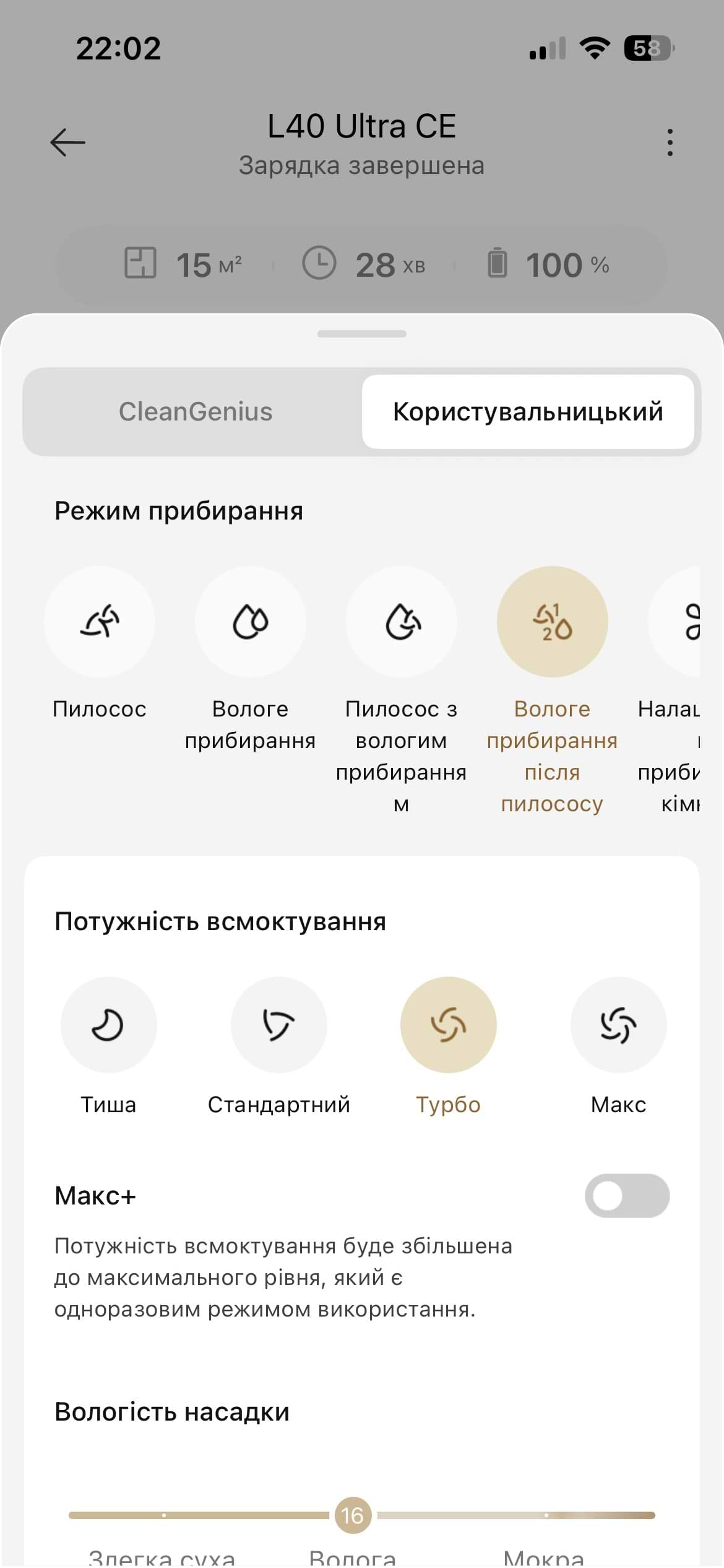 Це наш перший робот-пилосос миючий . Дуже задоволені даною моделлю! Гарно пилососить і вимиває, піднімається на коврики . Можна вибирати певну ділянку у квартирі , щоб прибрати. Незамінний помічник у побуті . Зручний додаток ! Топ за свої кошти !