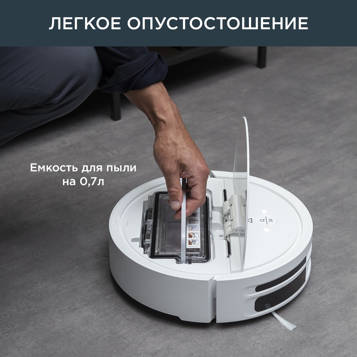 Удобный контейнер для пыли на 0,7 л можно опорожнять реже, используя эргономичную ручку в верхней части робота для комфортной очистки.