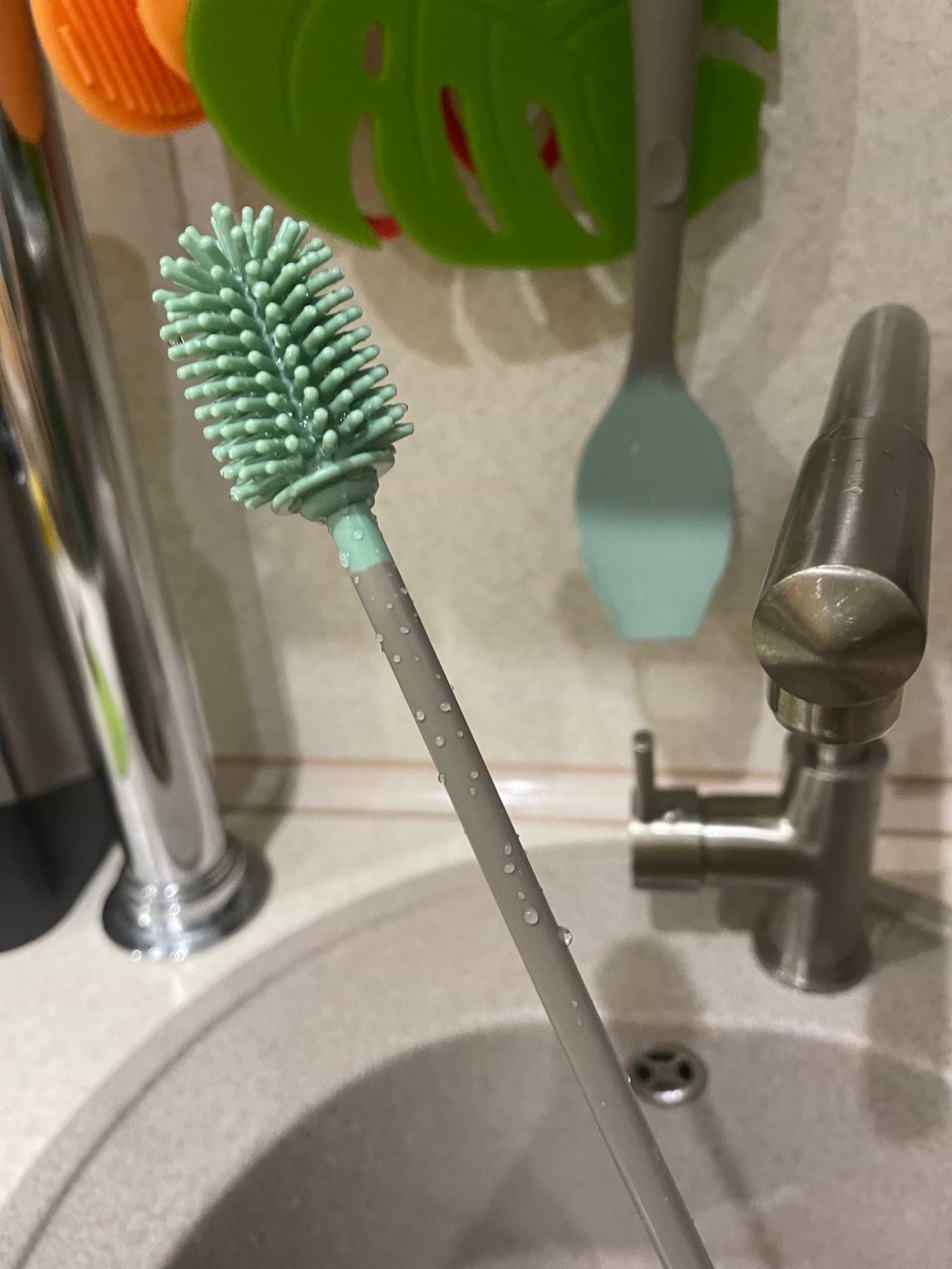 Сама щіточка м'якенька, невеликого розміру, тому зручно вимиває важкодоступні місця. Дуже подобається, що вона цільнолитита, тому сподіваюсь довговічна.