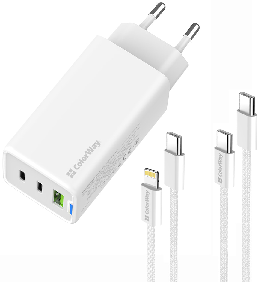 Сетевое зарядное устройство Colorway GaN Mini 65W PD Port PPS USB cable Type-C&Lightning (CW-CHS058PDCL-WT)