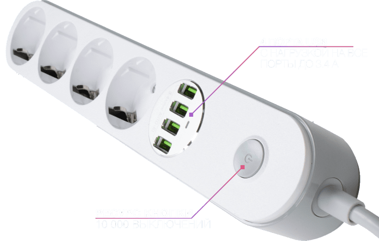 Кнопка выключения внутри серебряных контактов, поэтому пользоваться ею можно абсолютно уверенно. Она выдерживает более 10 000 нажатий без износа, что означает долговечное и стабильное пользование. Жаропрочный пластик, из которого сделан корпус, защищает от перегрева даже при нагревании до 750°C – это безопасность. Прочные и качественные контакты розеток состоят из бронзы.
