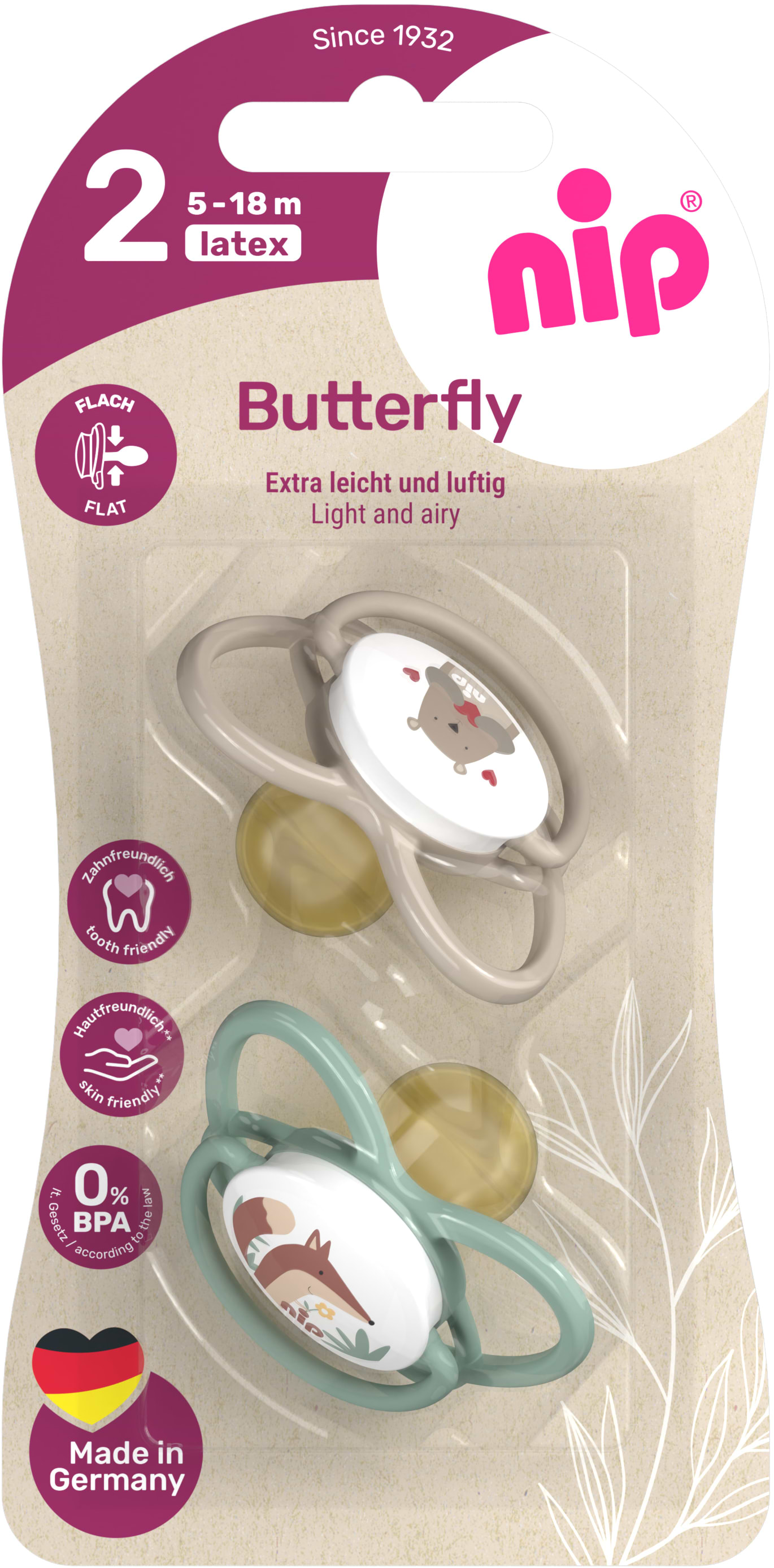 Все о Симметричная пустышка NIP Бабочка латексная 5-18 мес. зеленый/бежевый (31054-01)