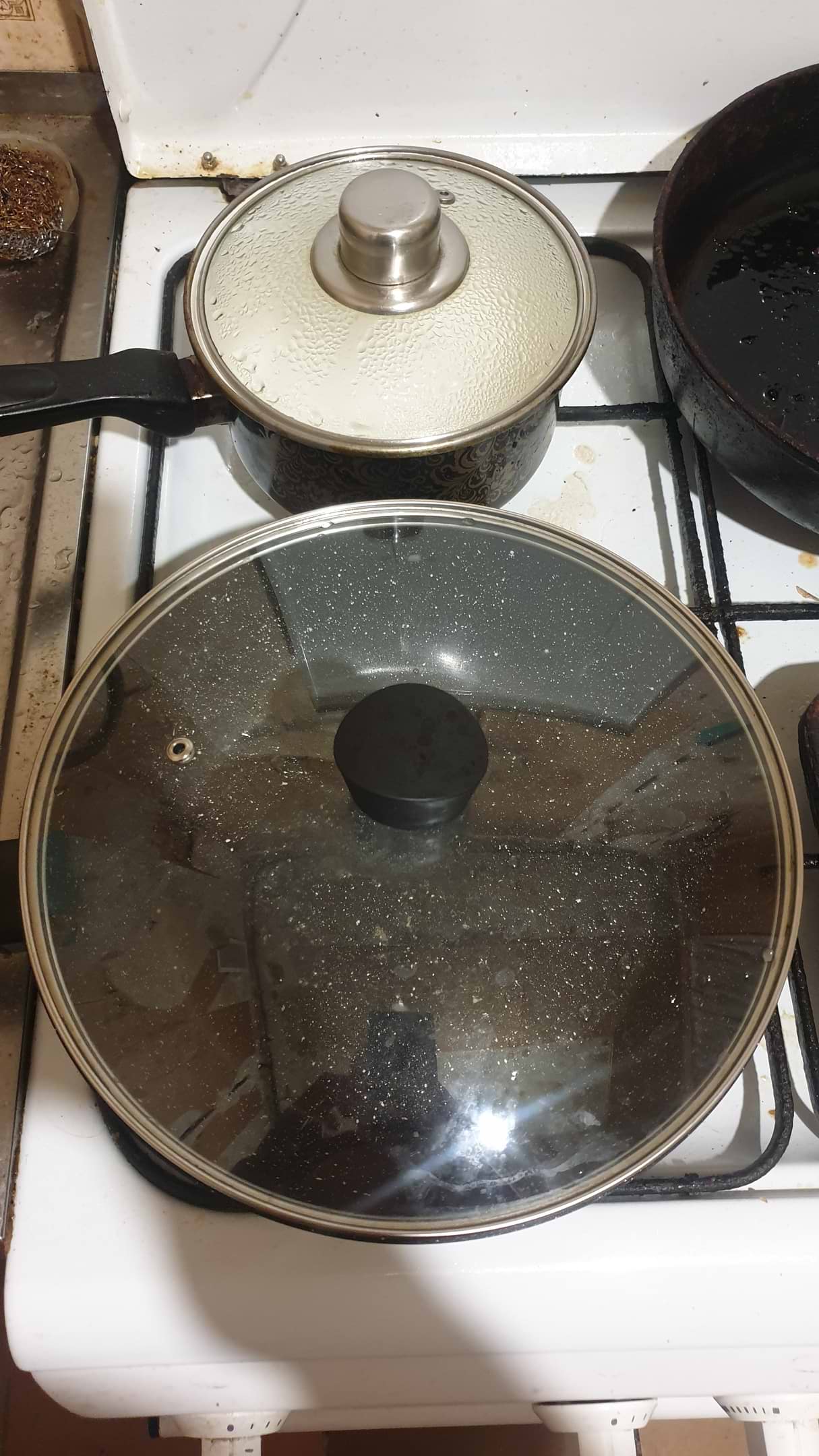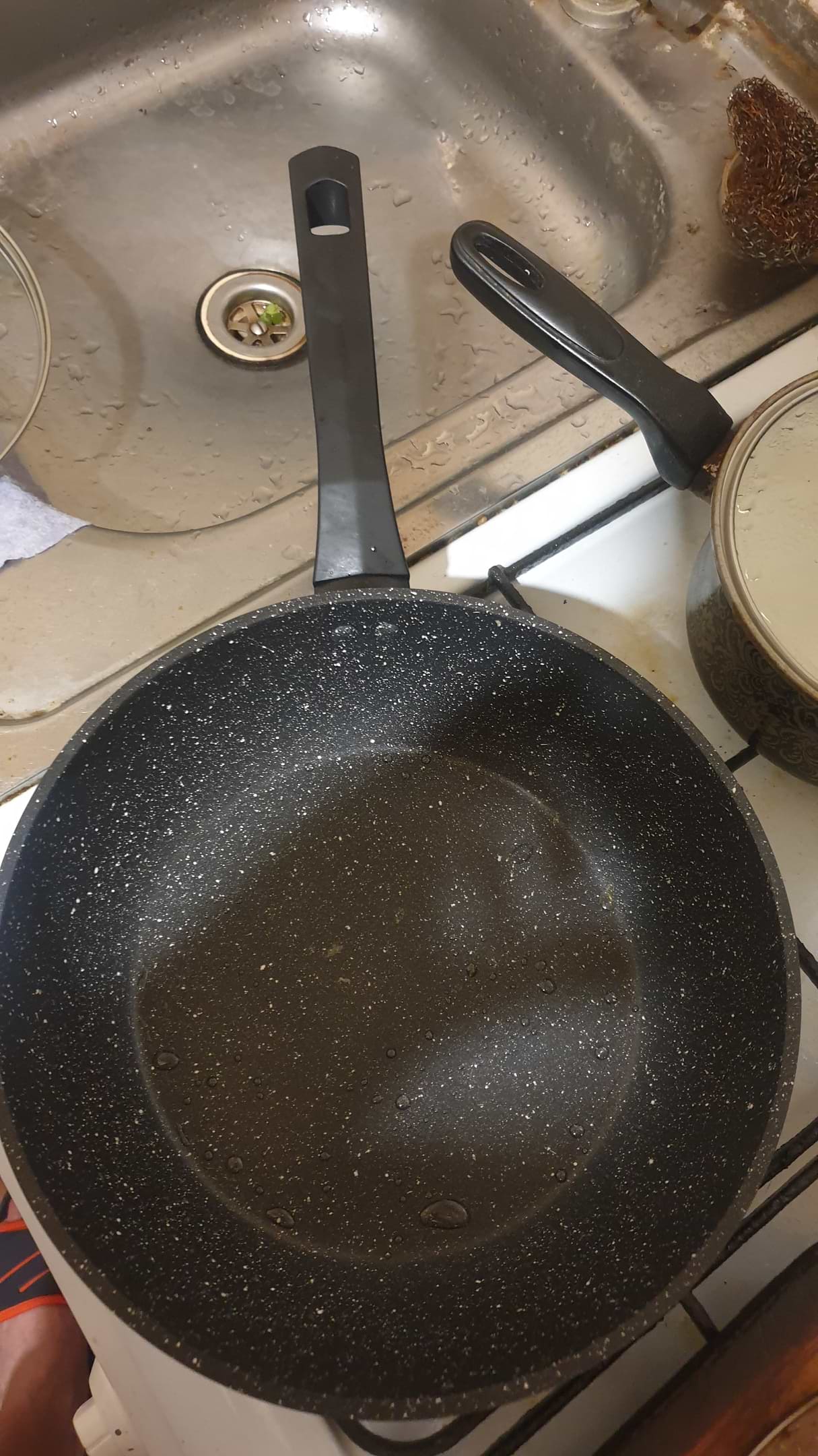Не пристаёт, очень маленький расход масла, удобная, не дорогая, и сразу с крышкой.