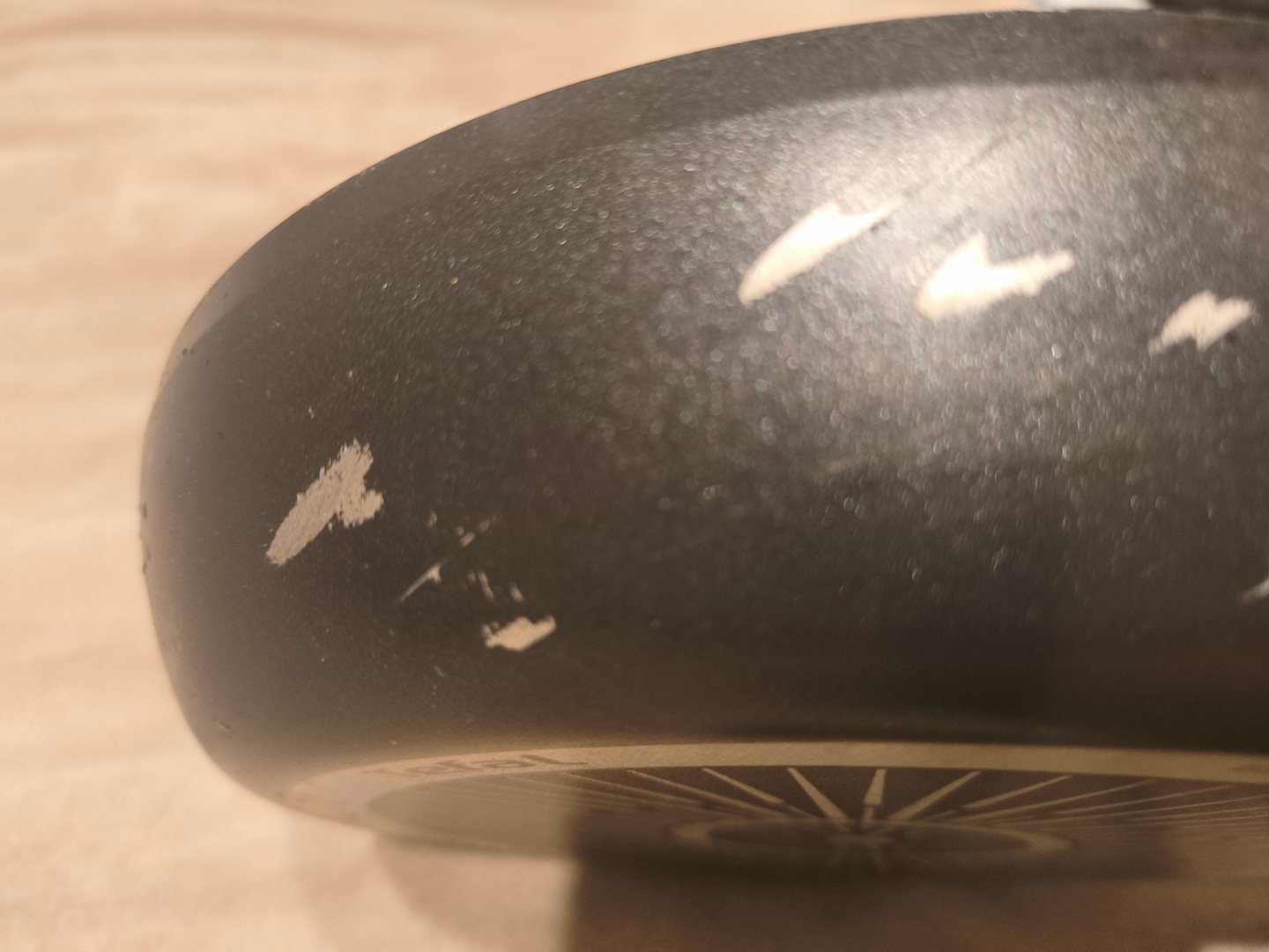 Купила вчора сковорідку. Сьогодні просмажила пиріжки, використовувала рідну фірмову лопатку. Коли взяла мити сковорідку, побачила це! Питання, як могло обдертися? 20 хв.використання. Мила охолоджену.