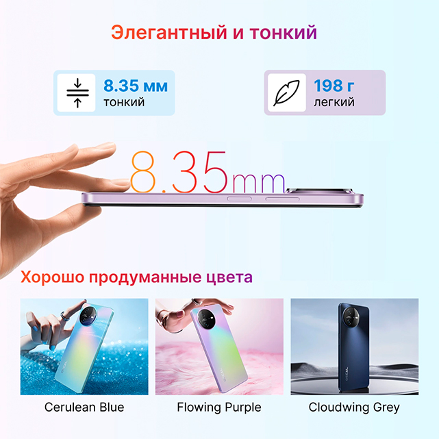 Смартфон Oscal TIGER 12 привлекает своим компактным и легким дизайном, толщина корпуса всего 8,35 мм, а вес всего 198 граммов. Смартфон предлагается в трех оригинальных цветах: голубой, ярко-фиолетовый и серый. Такой подход к разработке дизайна вместе с продуманной эргономичностью делает его отличным вариантом для тех, кто любит элегантность и комфорт в повседневной жизни.
