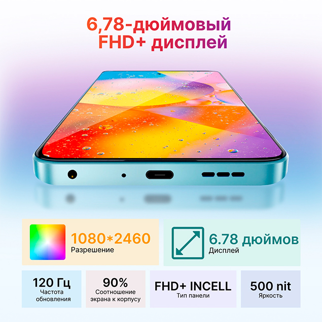 Oscal TIGER 12 оборудован большим 6,78-дюймовым FHD+ экраном с динамической частотой обновления 120 Гц. Такое решение обеспечивает яркое и детализированное изображение, плавное и четкое изображение с широким углом обзора, идеально подойдет для просмотра видео, игр и работы с различными приложениями.