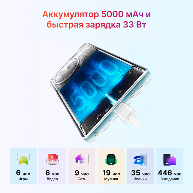 Мощный аккумулятор на 5000 мАч обеспечивает долговременную работу смартфона, даже при просмотре видео или работе с приложениями. Если же смартфон разрядился, то вы можете быстро его восстановить благодаря зарядному устройству на 33 Вт.
