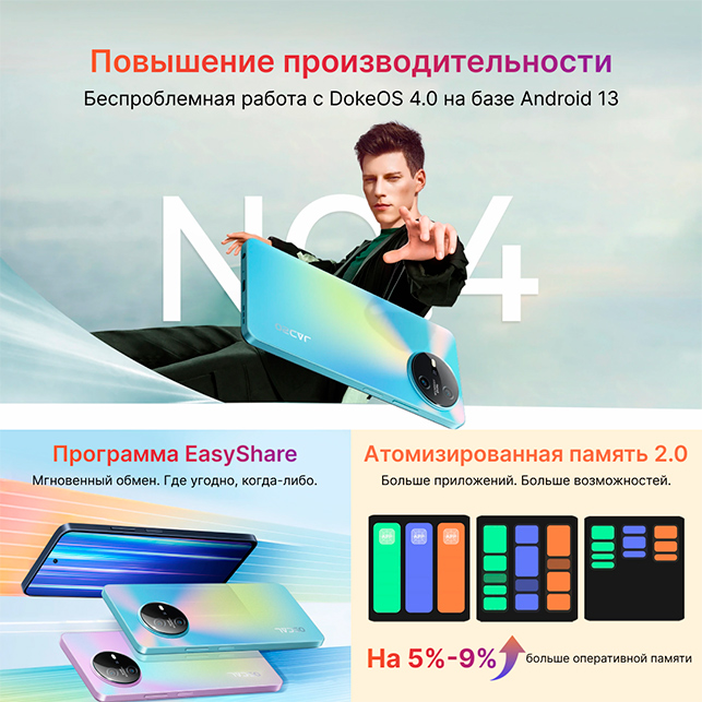 Oscal TIGER 12 имеет DokeOS 4.0 на базе Android 13, предлагая удобное и современное программное обеспечение. Система обладает простым в использовании интерфейсом и полезными функциями, например: EasyShare для мгновенного обмена данными и Atomized Memory 2.0 для эффективного управления памятью, обеспечивающей быструю и бесперебойную работу.