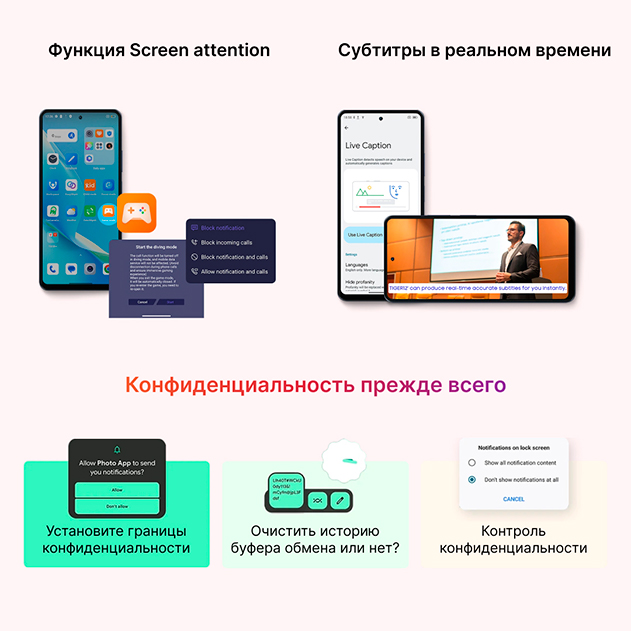 Oscal TIGER 12 имеет полезную функцию "Внимание к экрану", которая автоматически держит дисплей включенным, пока вы им активно пользуетесь. Дополнительные опции защиты данных делают работу со смартфоном еще более безопасной и комфортной.
