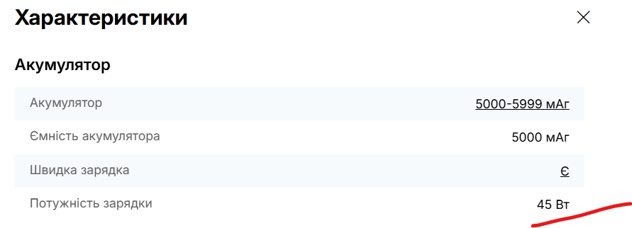 Телефон не підтримує зарядку 45Вт. Що від 25Вт, що від 45Вт зарядок приймає однаково 18-19 Вт. В характеристиках дезінформація.