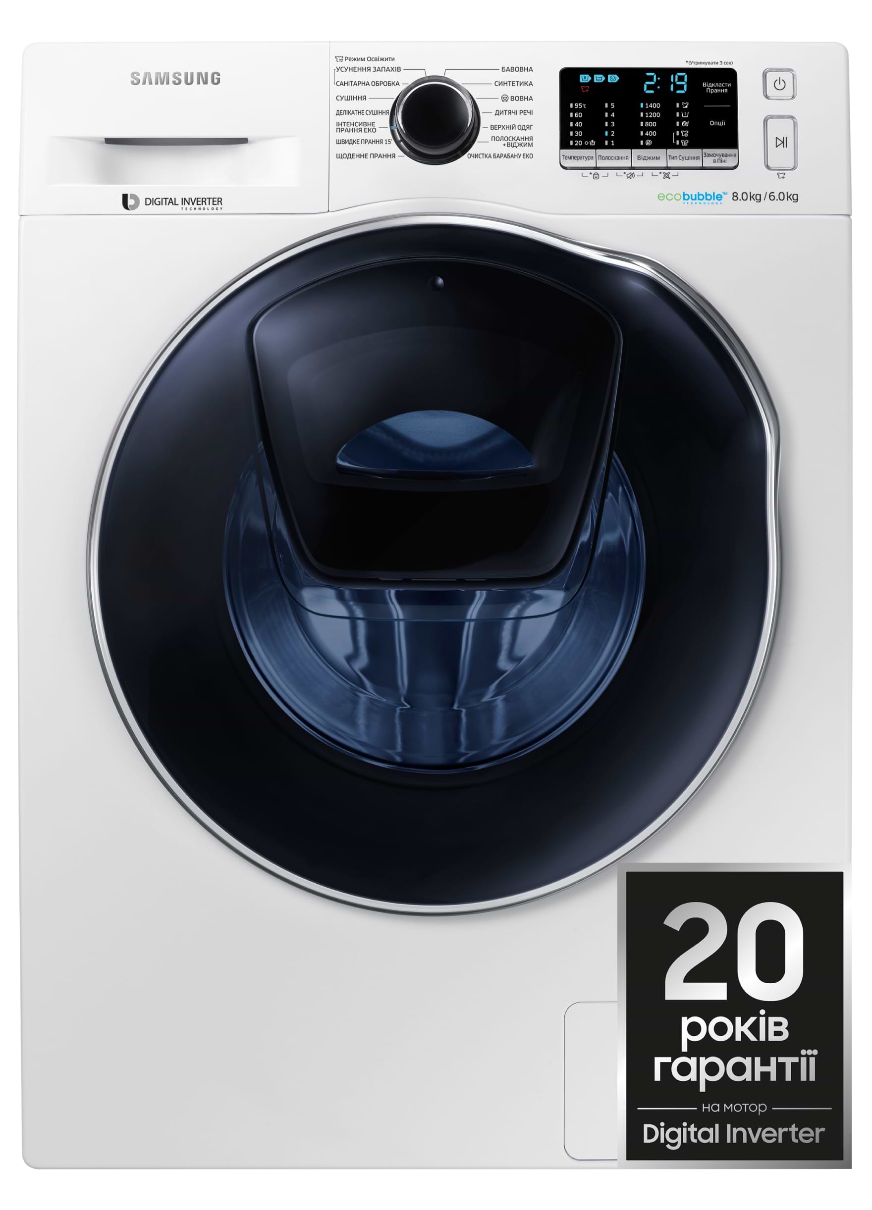 Особые качества стирально-сушильной машине Samsung WD80K5410OW/UA придает ее технологичное оснащение современными компонентами. Ключевым из них является инверторный двигатель, имеющий систему цифрового управления. Он имеет лучшие показатели по тишине своей работы, энергоэффективности, а также долговечности, в сравнении с обычными моторами в стиральных или сушильных машинах. Эти качества позволяют дополнять устройство 10-летней гарантией на моторный блок, что может служить еще одним плюсом в списке положительных качеств Samsung WD80K5410OW/UA.