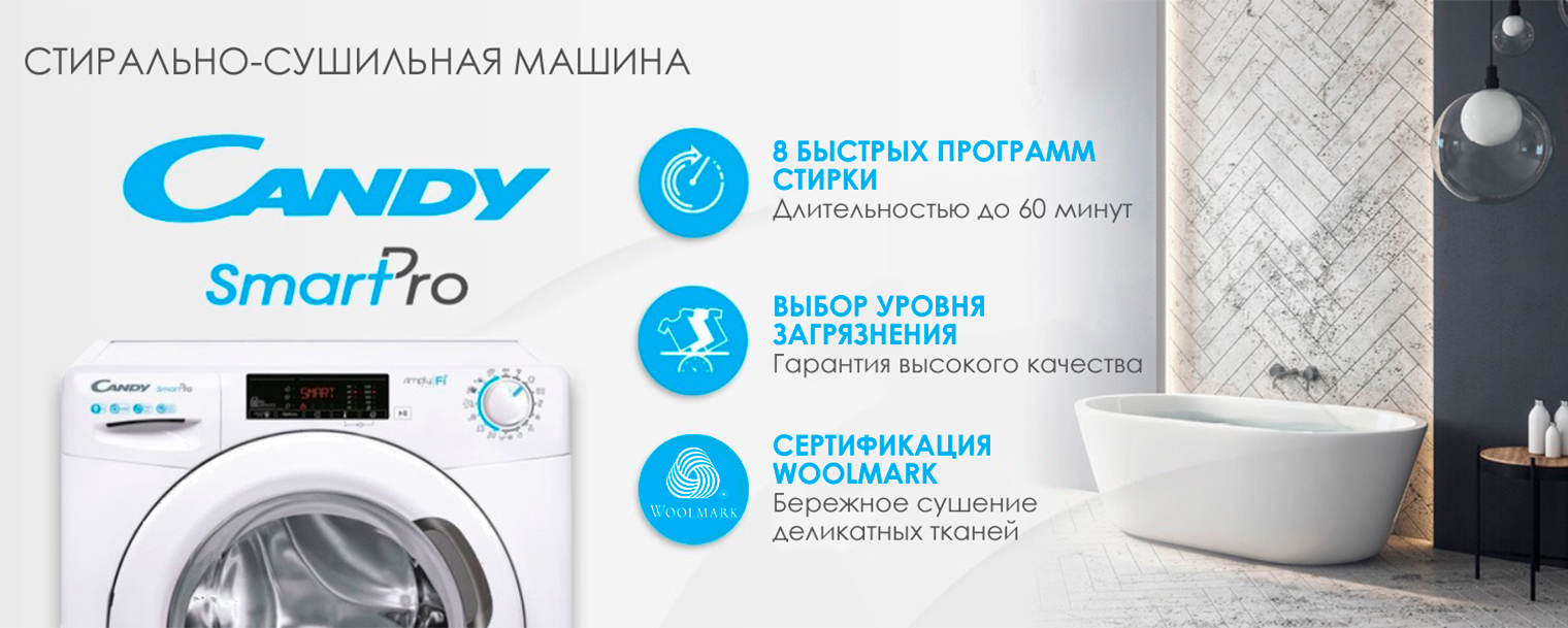 Эта стирально-сушильная машина от Candy имеет сертификат Woolmark — гарантию правильных температур, которые не повредят вещи из деликатных тканей, таких как вискоза, шерсть или шелк. Размер и форма сохранятся!