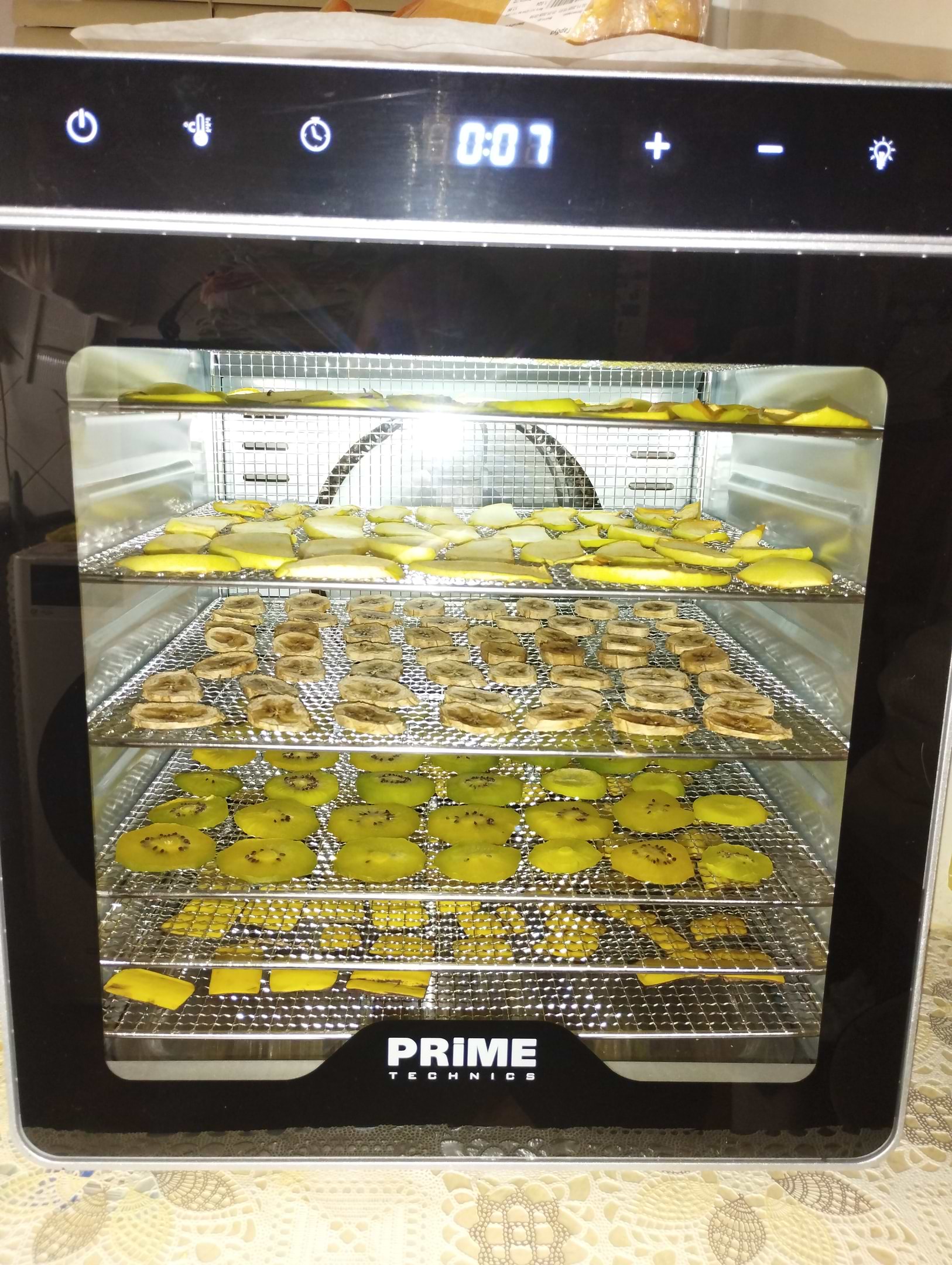 Майже 2 місяці вибирала собі сушарку. Зупинилась на цій, бо сподобалась по параметрам. Корпус міцний з нержавіючої сталі. Задоволена тим що металеві піддони. Сушила часник, перець болгарський, сливи сушить все добре. Є також піддон для крихти. Дуже тихо працює вентилятор, майже не чутно. А ще є підсвітка, що теж дуже зручно.