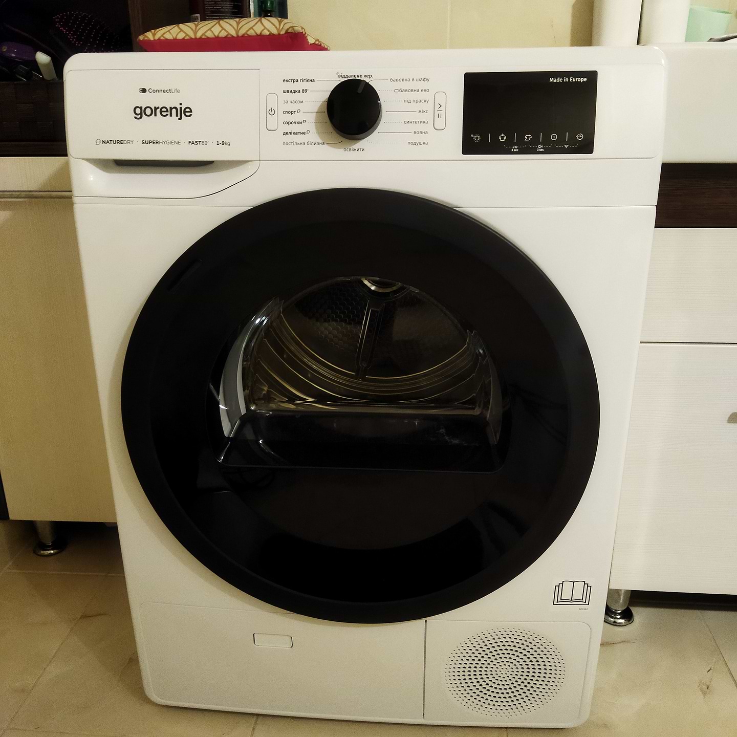 Сушильна машина Gorenje DPNE92GNLWIFI/UA, якісна збірка деталей, легка в керуванні, меню на українській мові. Одяг повністю сухий можна одразу складати в шафу. Не шумна.