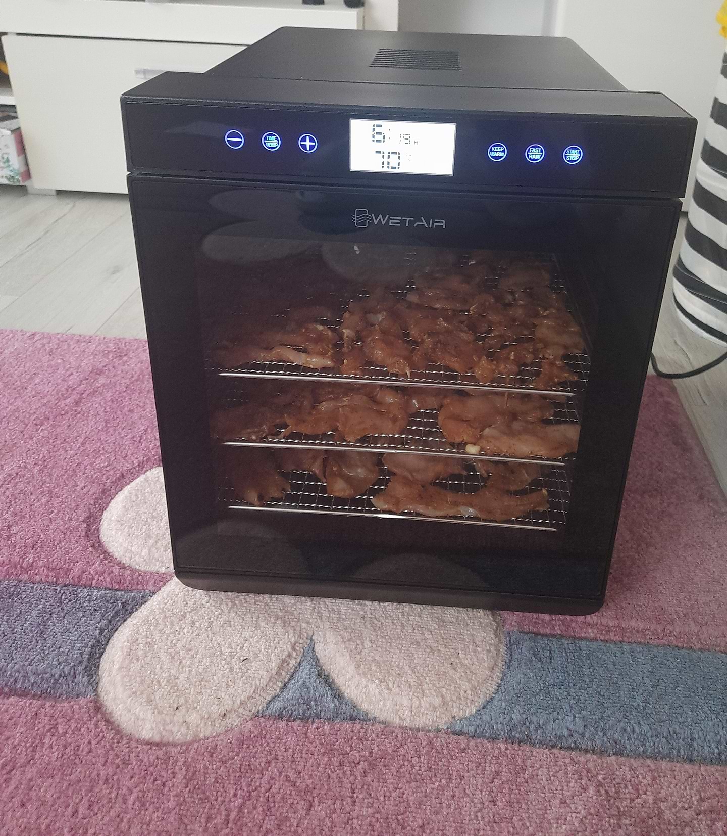 Давно мріяла придбати сушарку так як великі врожаї овочів і фруктів хочеться зберегти максимально корисними. Довгий час вибирала і зупинилась на WetAir. Дуже зручна сушка, жилізні решітки те що треба, сужитимуть довго. Тихо працює, якісно і рівномірно слушаться продукти. В цьому році великий видався врожай гарбуз от тепер маємо великий, смачний і корисний запас цукатів до кави та чаю. М'ясо курочки ну дуже смачне получається. Зручна в користуванні. Час приготування зележить від продукції та як її підготували. Покупкою дуже задоволена. Дякую comfy за швидку доставку та за якість обслуговування.