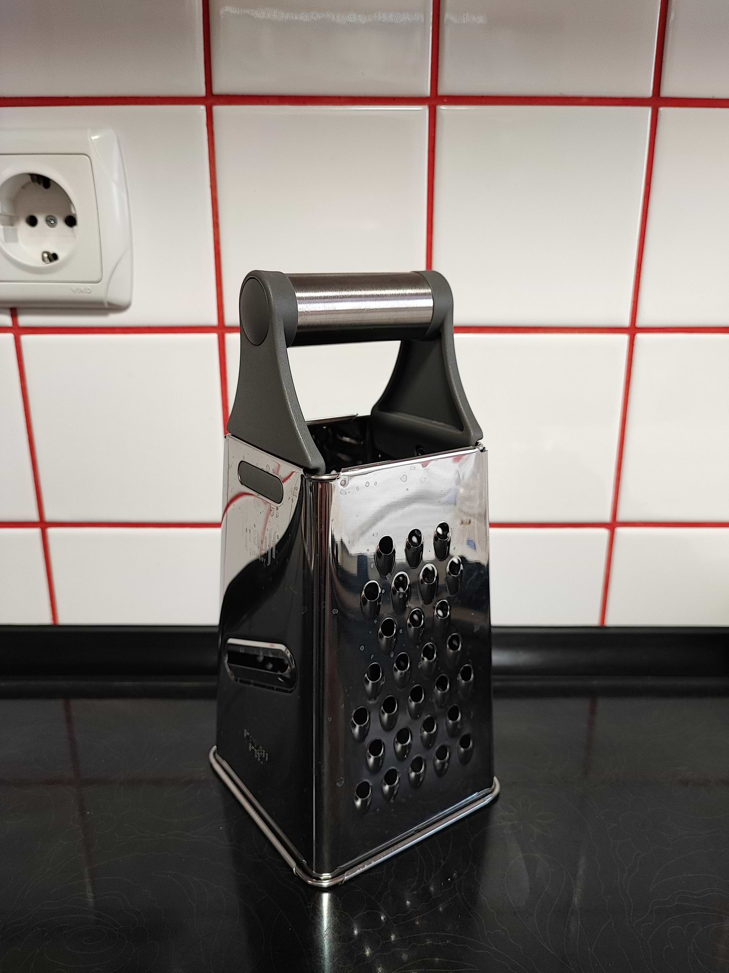 Терка удобная, удобно держать, не проржавела, устойчивая, пользуюсь около года. Резиновое основание не дает терке ерзать.