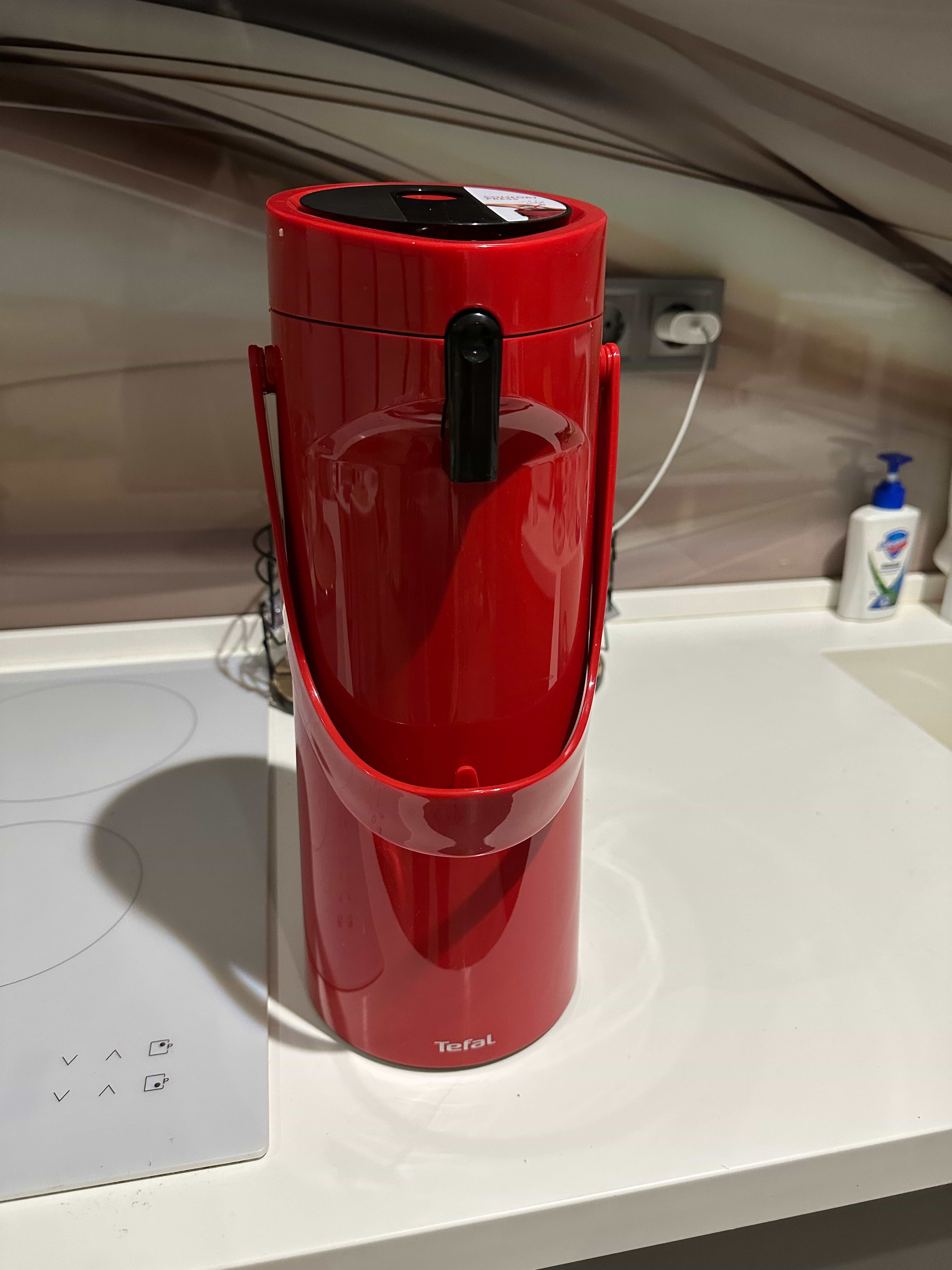 Коли маєш сидячу роботу і не маєш можливості відійти від компʼютера протягом дня, дуже зручно щоб поруч був термос ТЕФАЛЬ К3140214, який має приємний дизайн, чудово тримає гарячу температуру протягом 12 годин. Щоб налити воду, його не потрібно відкривати (достатньо декілька разів натиснути на клапан кнопку зверху), також термос має опцію обертання, зручну ручку для транспортування і маленьку підставку для чашки і що дуже важливо для багатьох людей скляну колбу.