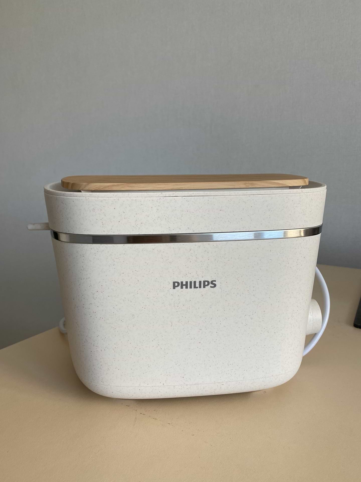 дуже естетичний тостер!!! працює на ура! Думала , що кришка зверху деревʼяна , але вона пластикова, імітація дерева. це ще краще, бо не буде боятися вологи. Перший раз, коли включаєш - запах пластику, а далі немає. Хліб рівномірно просушений зі всіх сторін. дуже задоволена, а головне що вписується гарно в інтерʼєр кухні, бо для мене це важливо