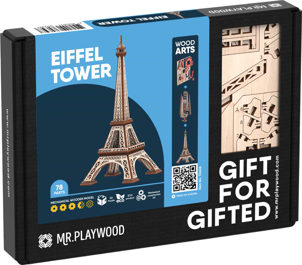 Головним символом і частиною міського пейзажу Парижа вже більше ста років є Ейфелева вежа. Але це надбання не лише Франції, але і пам'ятник світовим технічним досягненням кінця XIX століття. Зменшену копію 324-метрового витвору архітектора Гюстава Ейфеля тепер можна зібрати власноруч з дерев’яних деталей, що входять до комплектації 3D-моделі величної вежі від Mr.Playwood, їх необхідно лише від'єднати від планшетів і зібрати без клею за інструкцією