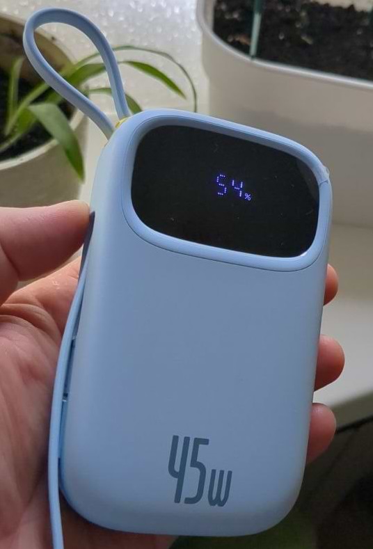 Повербанк сподобався, приємна форма, зручно що є два кабеля type-c та lighting - завжди під рукою, не потрібно шукати. Віддавав на порт 30 Вт. Заряджається 4-5 годин, від зарядки 100 Вт, що довго, як на мене. На початку бере 30 Вт, потім з часом скидає на 20, з підняттям рівня до 90% уповільнюється ще до 3-5 Вт.
