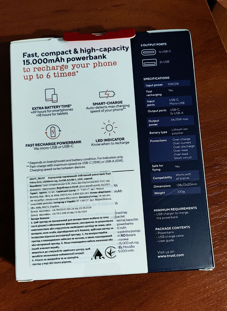 Заявлена ємність не збігається, тут намає 15000 mAh, максимум десь 5000. Вистачає зарядити телефон лише один раз.